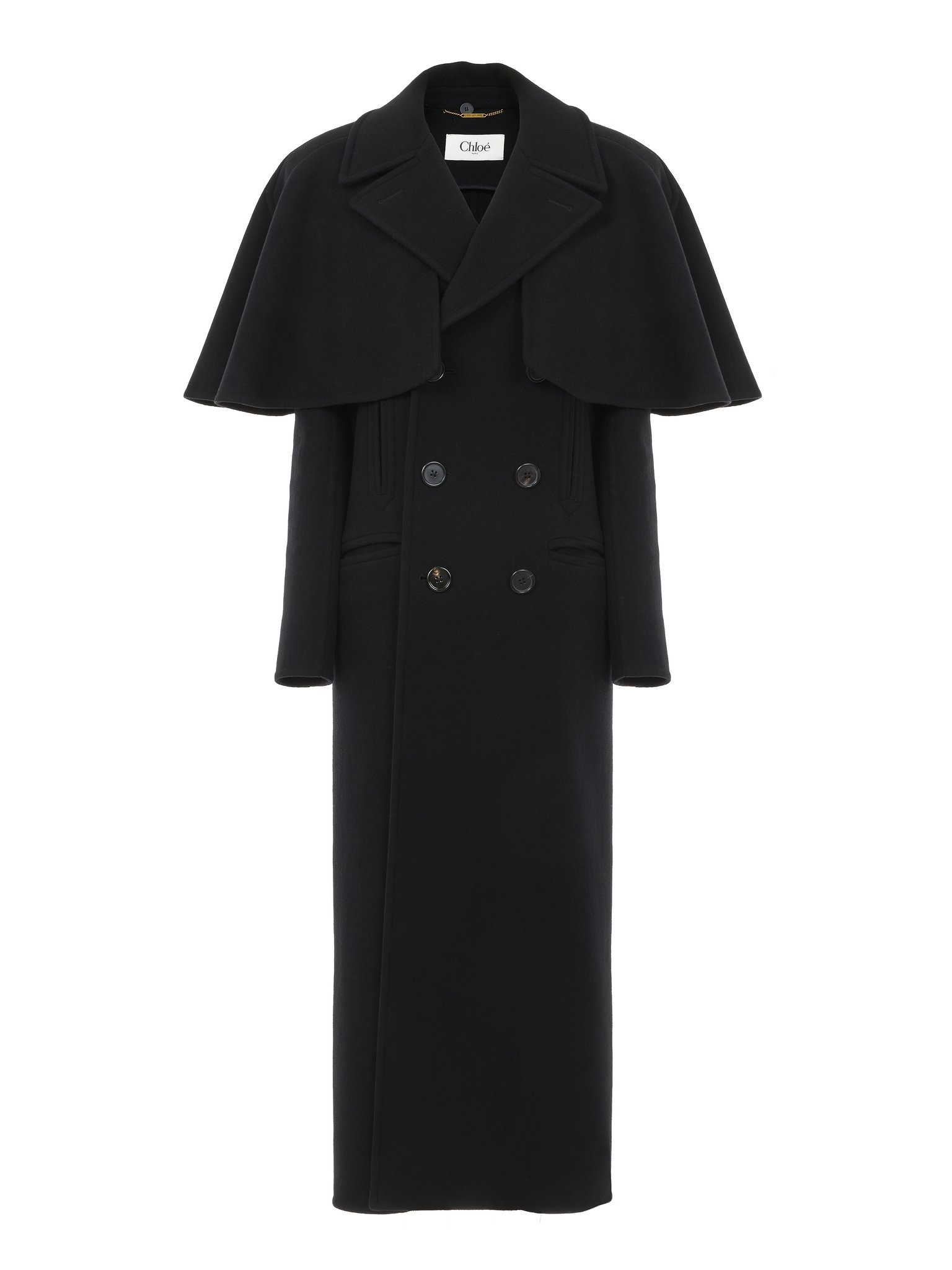 Double-breasted long coat in lower-impact double-face wool with a removable cape and horn buttons. PRODUCT DETAILS Long coat outer shell: 100% Wool Removable cape: 100% Wool Sleeve lining: 62% Viscose, 38% Cotton Buttons: 100% Horn Fit: long - The model is 5’10” (178 cm) and wears a prototype in size 34 - Double-breasted wool coat - Horn buttons - 4 front pockets Care: dry cleaning only The wool used in this product comes from a farm that respects animal welfare, maintains soil health, protects biodiversity and promotes native species. Color: Black Item code: CH24WMA05161001