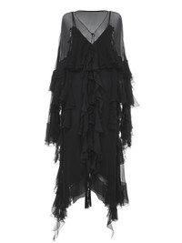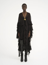 Long ruffled dress in semi-sheer organic silk mousseline, featuring a deep V-neckline and maxi sleeves. PRODUCT DETAILS Long ruffle dress outer shell: 100% Silk Separate lining: 100% Silk Care: dry cleaning only Fit: long sleeves, long - The model is 5'10" (178 cm) and wears a prototype in size 36 - Long evening dress - Separate lining - Covered button at front This product is made from organic silk. Organic silk manufacturing restricts the use of pesticides, insecticides or harsh chemicals and incorporates methods that respect biodiversity, improve soil quality and reduce water consumption. This product was made in collaboration with Akanjo, a certified WFTO supplier. Akanjo is a social enterprise located in Madagascar that places equal pay and employees' health & wellbeing at the core of their priorities. A long-standing partner of Chloé for 15 years, Akanjo is also committed to training and promoting craftsmanship. Color: Black Item code: CH24ARO50001001