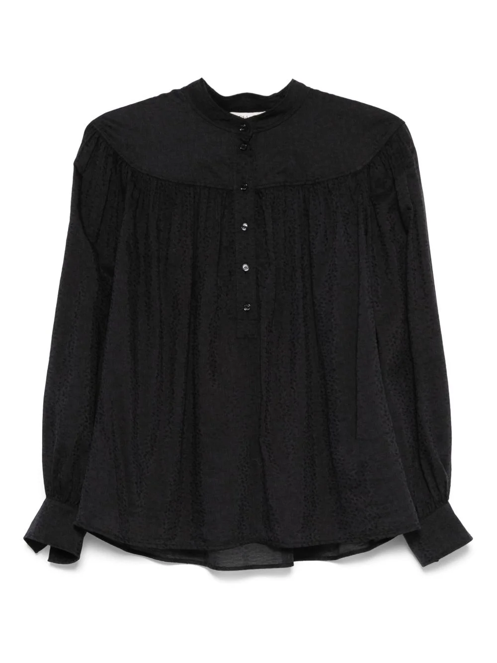 long-sleeve blouse Highlights - Black - Button-down collar - Band collar - Buttoned cuffs - Semi-sheer construction Imported Composition Mother of Pearl 100%, Viscose 57%, Cotton 43% SIZE & FIT Model measurements Height 5 ft 9 in(1.75 m) Bust/Chest 34.64 in(88 cm) Hips 36.61 in(93 cm) Waist 26.37 in(67 cm) FittingInformation Designed for a relaxed fit, this piece allows for comfort and movement when worn Made from a midweight non-stretch fabric, this piece offers minimal elasticity when worn
