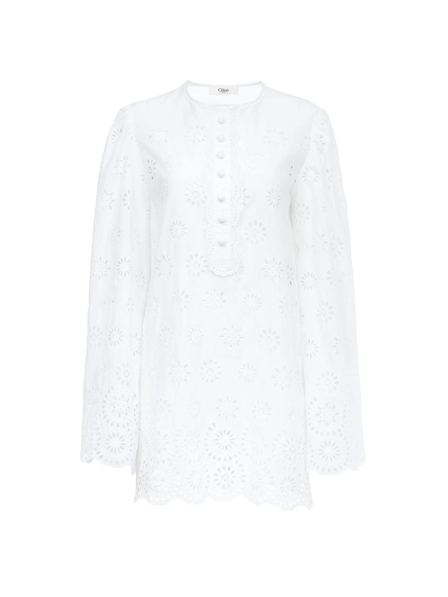 Round-neck long-sleeve mini dress in cotton voile with floral broderie anglaise and a separate cotton lining, detailed with fabric-covered buttons at the front. PRODUCT DETAILS Long-sleeve mini dress outer shell: 90% Cotton, 10% Polyester Separate lining: 100% Cotton Button placket: 96% Cotton, 4% Polyester Fit: straight, mini length - The model is 5'10" (178 cm) and wears a prototype in size 36 - Embroidered cotton mini dress - Fabric-covered buttons at front Color: Iconic Milk Item code: CH25ARO44699107