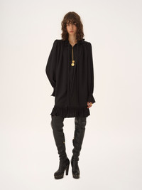 DESCRIPTION Tie-front long-sleeve mini dress in organic silk crepe de chine, featuring a high neck, ruffles and mother-of-pearl buttons. PRODUCT DETAILS Long-sleeve mini dress outer shell: 100% Silk Buttons: 100% Mother-of-pearl Fit: fluid, mini length - The model is 5'10" (178 cm) and wears a prototype in size 36 - Long-sleeve silk dress - Front tie fastening - Mother-of-pearl buttons at front & cuffs Organic silk manufacturing restricts the use of pesticides, insecticides or harsh chemicals and incorporates methods that respect biodiversity, improve soil quality and reduce water consumption. This product was made in collaboration with Akanjo, a certified WFTO supplier. Akanjo is a social enterprise located in Madagascar that places equal pay and employees' health & wellbeing at the core of their priorities. A long-standing partner of Chloe for 15 years, Akanjo is also committed to training and promoting craftsmanship. Color: Black Item code: CH26SRO10005001 CARE INSTRUCTIONS To preserve the integrity of your garment, please refrain from washing, entrusting its care to professional cleaning services for optimal maintenance. This garment cannot withstand any bleaching agent. To maintain its shape, gently iron this garment at a maximum sole plate temperature of 110°C, taking care to avoid any harsh pressure while ironing. Entrust this garment to a specialist for mild cleaning with tetrachloroethylene and solvent F, ensuring its delicate nature is maintained with the most care. To best preserve its form and texture, please do not tumble dry this garment. To maintain its delicate nature, do not wet clean this garment. TRACEABILITY Better traceability is central to improving our materials as well as social and environmental practices. Dyeing: Italy Finishing: Italy Weaving: Italy