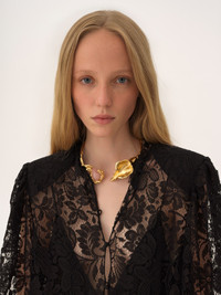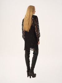 DESCRIPTION High-neck mini dress in floral lace with a separate silk-mix lining, featuring long puff sleeves and fabric-covered buttons. PRODUCT DETAILS Long-sleeve mini dress outer shell: 79% Cotton, 21% Polyamide Lining: 76% Acetate fiber, 24% Silk Fit: fluid, mini length - The model is 5'10" (178 cm) and wears a prototype in size 34 - Lace dress - Fabric-covered buttons at front - Back hook & zipper fastening - Separate lining Color: Black Item code: CH26SRO67413001 CARE INSTRUCTIONS To preserve the integrity of your garment, please refrain from washing, entrusting its care to professional cleaning services for optimal maintenance. This garment cannot withstand any bleaching agent. To maintain its shape, gently iron this garment at a maximum sole plate temperature of 110°C, taking care to avoid any harsh pressure while ironing. Entrust this garment to a specialist for mild cleaning with tetrachloroethylene and solvent F, ensuring its delicate nature is maintained with the most care. To best preserve its form and texture, please do not tumble dry this garment. To maintain its delicate nature, do not wet clean this garment. TRACEABILITY Better traceability is central to improving our materials as well as social and environmental practices. Dyeing: France Finishing: France Weaving: France