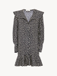 DESCRIPTION V-neck long-sleeve mini dress in silk jacquard with a dots print, featuring ruffles and fabric-covered buttons. PRODUCT DETAILS Long-sleeve mini dress outer shell: 100% Silk Lining: 76% Acetate fiber, 24% Silk Fit: fluid, mini length - The model is 5'10" (178 cm) and wears a prototype in size 36 - Long-sleeve silk dress - Fabric-covered buttons at front & cuffs Color: Black Item code: CH26SRO37300915 CARE INSTRUCTIONS To preserve the integrity of your garment, please refrain from washing, entrusting its care to professional cleaning services for optimal maintenance. This garment cannot withstand any bleaching agent. To maintain its shape, gently iron this garment at a maximum sole plate temperature of 110°C, taking care to avoid any harsh pressure while ironing. Entrust this garment to a specialist for mild cleaning with tetrachloroethylene and solvent F, ensuring its delicate nature is maintained with the most care. To best preserve its form and texture, please do not tumble dry this garment. To maintain its delicate nature, do not wet clean this garment. TRACEABILITY Better traceability is central to improving our materials as well as social and environmental practices. Finishing: Italy Weaving: China