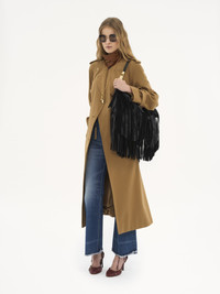 Water-repellent long trench coat in organic cotton gabardine with a fluid, double-breasted silhouette, featuring a leather chin-strap collar, a belt and engraved horn buttons. PRODUCT DETAILS Long trench coat outer shell: 100% Cotton Leather element: 100% Lambskin Lining: 62% Viscose, 38% Cotton Buttons: 100% Horn Fit: fluid - The model is 5'10" (178 cm) and wears a prototype in size 36 - Double-breasted trench coat - Removable belt - Buttoned side pockets - Engraved horn buttons - Buckled tabs at cuffs and shoulders - Leather chin-strap collar Care: dry cleaning only An organic cotton farming system sustains the health of soils, ecosystems and people by eliminating the use of toxic and persistent organic pollutants and increasing water conservation. Color: Past Khaki Item code: CH25SMA1934121D