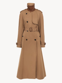 Long trench coat in cotton gabardine, featuring engraved horn buttons, a lambskin-trimmed chin-strap collar and a removable buckled belt. A storm flap, shoulder tabs and cuff tabs finish this piece. PRODUCT DETAILS Long trench coat outer shell: 100% Cotton Main lining: 62% Viscose, 38% Cotton Under collar: 100% Lambskin Buckle: 50% Calfskin, 50% Zamak Buttons: 100% Water buffalo horn Fit: straight, long - The model is 5'10" (178 cm) and wears a prototype in size 36 - Belted trench coat - Chin strap - Side pockets - Buckled cuff tabs - Engraved horn buttons - Storm flap - Belt loops - Back vent Color: Golden Brown Item code: CH25AMA1909320Y