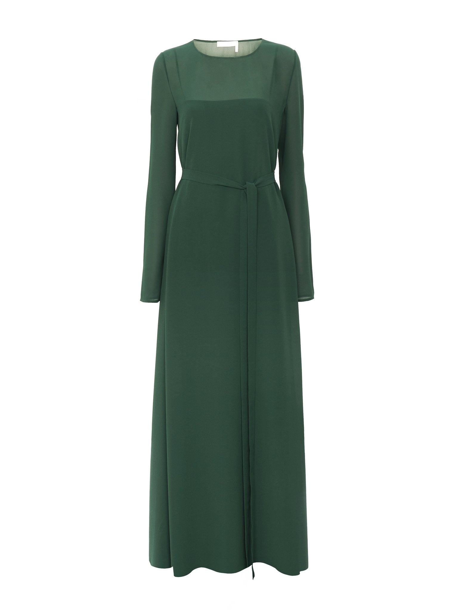 Crafted from a light and sheer silk georgette woven from organically produced silk, this long tunic dress is an elegant day-to-evening piece with a self-fabric belt and separate lining. The flattering, flou silhouette exudes a romantic spirit. PRODUCT DETAILS Long tunic dress main material: 100% Silk Care: dry cleaning only Fit: long sleeves, classic - The model is 5'10'' (178 cm) and wears a prototype in size 36 - Silk dress - Self-fabric belt - Separate lining This product is made from organic silk. Organic silk manufacturing restricts the use of pesticides, insecticides or harsh chemicals and incorporates methods that respect biodiversity, improve soil quality and reduce water consumption. Color: Dark Pine Item code: CHC23WRO450023M8