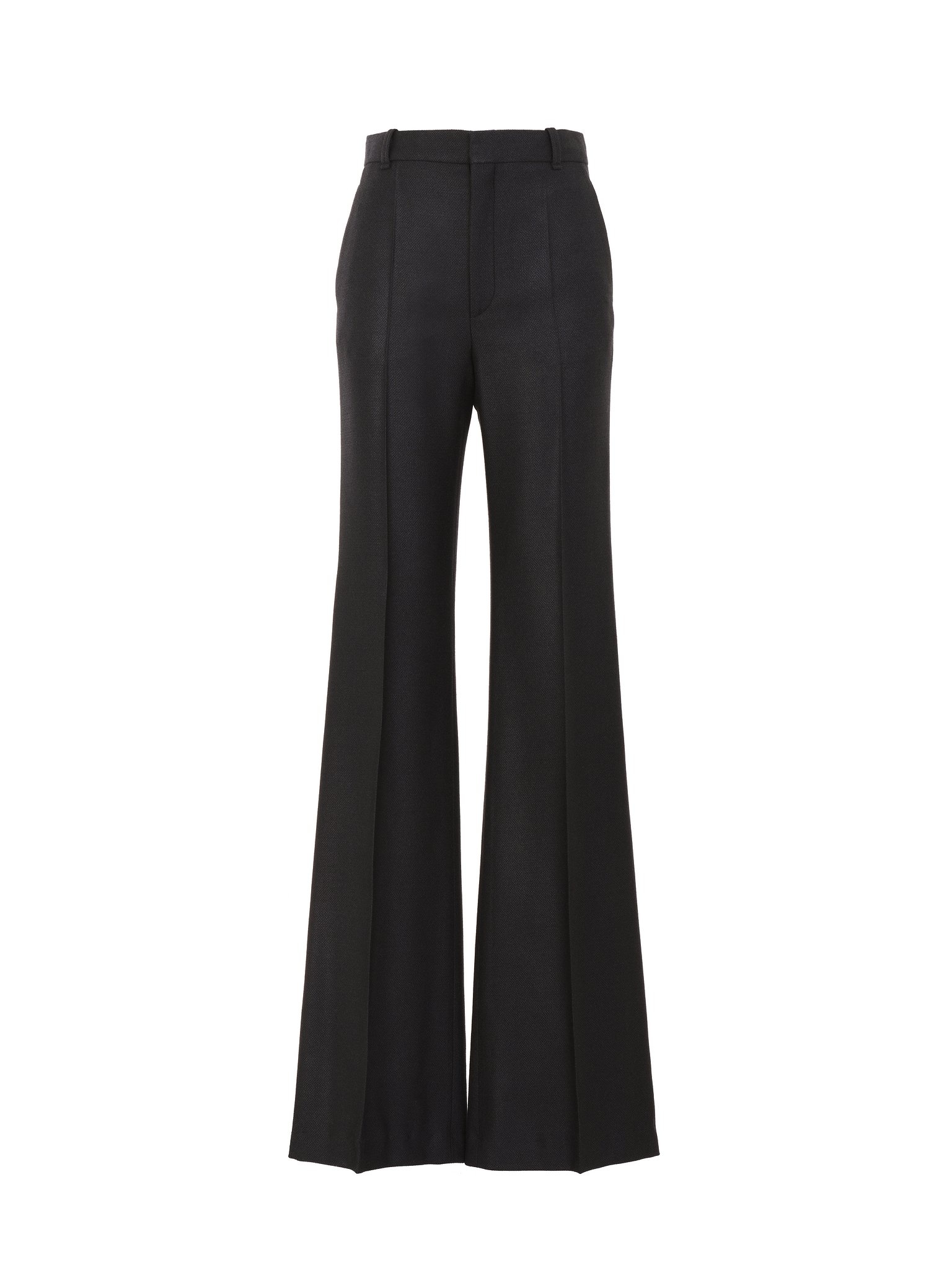 Cut from the Maison's classic lower-impact stretch wool in a bootcut design, these low-waist flare pants are a timeless wardrobe classic with a flattering, elongated silhouette. PRODUCT DETAILS Flare pants main material: 95% Wool, 5% Elastane Pocket lining: 100% Ramie Care: dry cleaning only Fit: low waist, flared - The model is 5'10'' (178 cm) and wears a prototype in size 36 - Wool pants - Front hook & zipper fastening - Side pockets - Back welt pockets - Belt loops The wool used in this product comes from a farm that respects animal welfare, maintains soil health, protects biodiversity and promotes native species. Color: Black Item code: CHC23WPA05062001