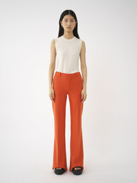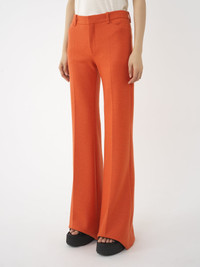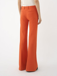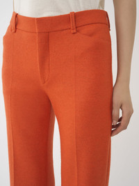 Crafted from a light and comfortable wool and cashmere-blend felted jersey, these low-waist flare pants will add a pop of color to your wardrobe. The elongated leg and pressed front creases enhance the tailored silhouette, making these vibrant pants a statement piece. Wear the pants with the matching tailored jacket for a fun set. PRODUCT DETAILS Flare pants main material: 90% Wool, 10% Cashmere Pocket lining: 100% Ramie Care: dry cleaning only Fit: low waist, flared - The model is 5'10" (178 cm) and wears a prototype in size 35 - Wool pants - Front hook & zipper fastening - Front pockets - Piped back pockets - Belt loops Color: Brick Orange Item code: CHC24SPA02089826