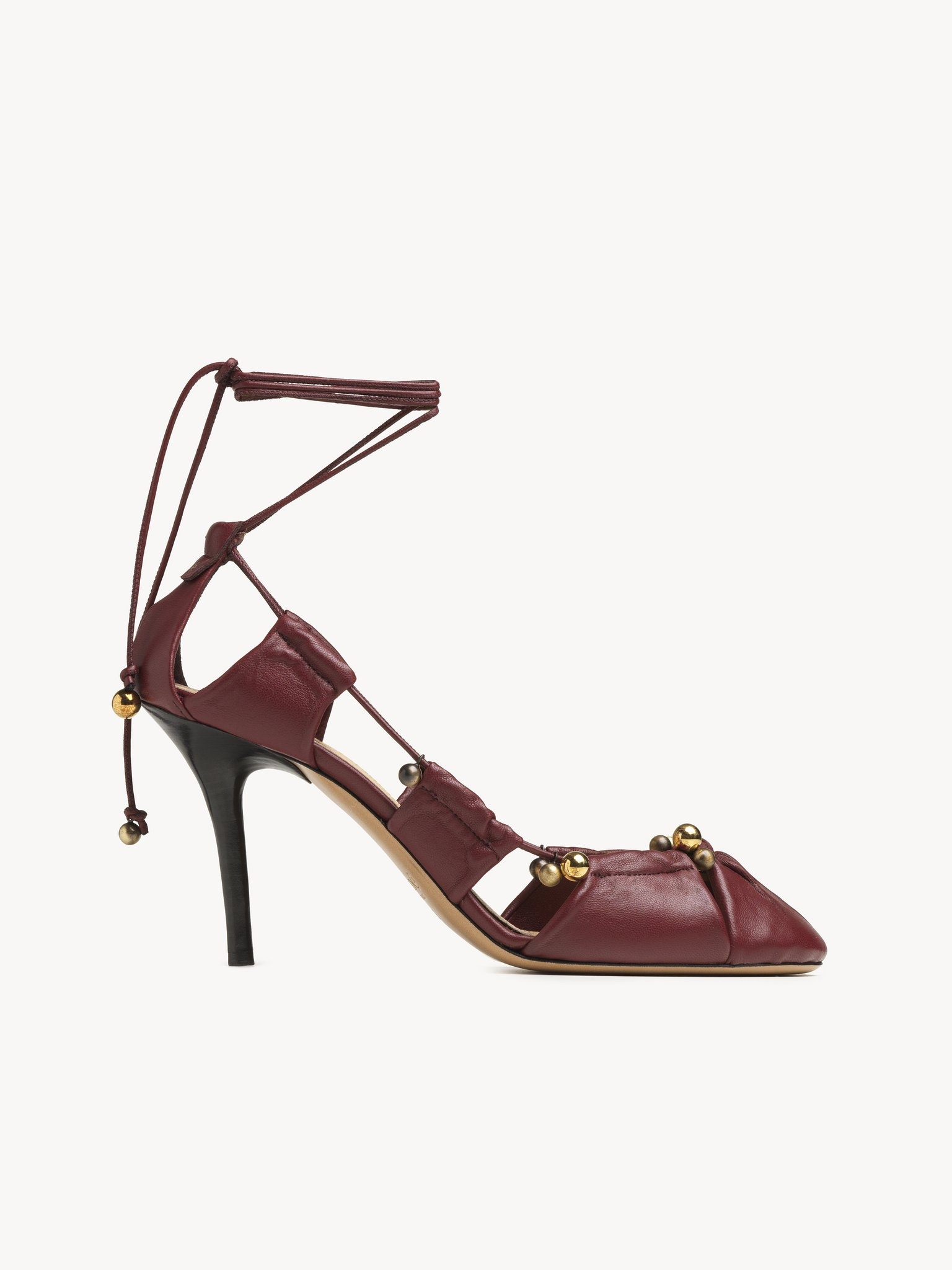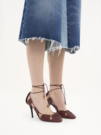 Crafted from shiny sheepskin, the Luna pumps are inspired by a Chloe archive. The pleated cutout silhouette creates a deconstructed effect, elevated with antique gold bells. Knotted straps wrap around the ankles while the Chloe logo finishes the back of the shoe. PRODUCT DETAILS Pump heel height: 3.5" (9 cm) Heel-to-toe drop: 3.5" (9 cm) Upper: sheepskin Inner sole: sheepskin Main lining: sheepskin Secondary lining: suede goatskin Sole: cowhide Heel: cowhide Fit true to size, European sizing - Lace-up To make this product, Chloe worked with Leather Working Group (LWG) certified leather manufacturers. LWG certifies tanneries based on their water and energy usage, management of chemicals, solid waste, and wastewater. Color: Stormy Red Item code: CHC25S08KQL610