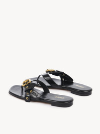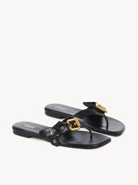 The Mae sandals are crafted from shiny calfskin with a distinctive soft insole. The thong front is embellished with knotted straps debossed with the Chloe logo, gold-tone eyelets and the Maison's Paddington buckle. PRODUCT DETAILS Sandal heel height: 0.4" (1 cm) Heel-to-toe drop: 0.2" (0.5 cm) Upper: calfskin Inner sole: calfskin Main lining: calfskin Sole: cowhide Fit true to size, European sizing - Slip-on To make this product, Chloe worked with Leather Working Group (LWG) certified leather manufacturers. LWG certifies tanneries based on their water and energy usage, management of chemicals, solid waste, and wastewater. Color: Black Item code: CHC25S08OQJ001