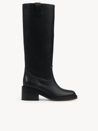 Deeply rooted in the Chloé DNA, the comfortable yet timeless Mallo high boot is updated in this monochrome version crafted from soft calfskin in an effortlessly chic design. The refined, authentic stacked leather heel is paired with a sleek upper featuring elegant lines and distinctive saddle stitches in a nod to the line's equestrian inspiration. Easy to slip on and off, this soft knee-high boot has an almond toe shape for a delicate, feminine finish. PRODUCT DETAILS Tall boot heel height: 2.4" (6 cm) Heel-to-toe drop: 2" (5 cm) - Inner sole: goatskin - Upper: calfskin - Sole: 50% cowhide, 50% thermoplastic polyurethane - Main lining: cowhide - Heel: cowhide Fit true to size, European sizing - Slip-on knee-high boot Color: Black Item code: CHC23W684GB001