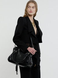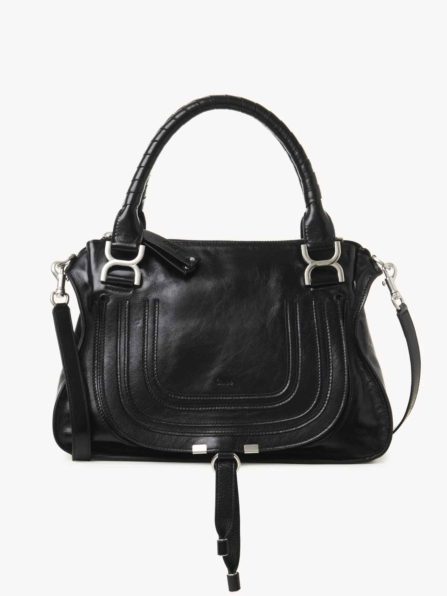 Crafted from shiny calfskin, this Marcie purse has a slouchy silhouette with feminine lines. It is finished with saddle stitching, silver-tone buckles and hand-wrapped double handles. The line's dangling leather closure secures the flap. Carry this leather bag in the hand, on the shoulder or cross-body with the handles or strap. PRODUCT DETAILS Shoulder bag in shiny calfskin Main material: Calfskin Main lining: Split calfskin Flap lining: Split calfskin Carry: Hand, shoulder & cross-body - 1 Roomy compartment - 1 Front slip pocket hidden by the flap - 1 Internal zippered pocket - Removable leather strap - Zippered closure Comes with a dust bag - Width: 14.2" (36 cm) - Height: 11" (28 cm) - Depth: 4.7" (12 cm) - Min. strap drop: 18.5" (47 cm) - Max. strap drop: 20.5” (52 cm) This handbag is made from semi-aniline leather. The half-transparent finish imparts a robust nature to the product while preserving its natural character. Follow all care instructions on the insert. To make this product, Chloé worked with Leather Working Group (LWG) certified leather manufacturers. LWG certifies tanneries based on their water and energy usage, management of chemicals, solid waste, and wastewater. Color: Black Item code: CHC24AS660N90001