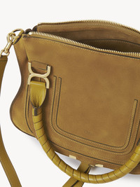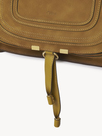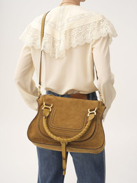 Crafted from suede calfskin, this Marcie double carry bag has a slouchy silhouette with feminine lines and contrasting detail. It is finished with saddle stitching, iconic gold-tone buckles and hand-wrapped double handles. The line's dangling leather tassels secure the flap. Carry this handbag in the hand, on the shoulder or crossbody with the handles or strap. PRODUCT DETAILS Marcie handbag in suede calfskin Main material: Calfskin Main lining: Calfskin Flap lining: Calfskin Carry: Hand, shoulder & crossbody - 1 roomy compartment - 1 front slip pocket hidden by the flap - 1 inside zippered pocket - 1 removable leather strap - Zip closure Comes with a dust bag - Width: 14.2" (36 cm) - Height: 11" (28 cm) - Depth: 4.7" (12 cm) - Min. strap drop: 18.5" (47 cm) - Max. strap drop: 20.5" (52 cm) To make this product, Chloe worked with Leather Working Group (LWG) certified leather manufacturers. LWG certifies tanneries based on their water and energy usage, management of chemicals, solid waste, and wastewater. Color: Gold Khaki Item code: CH25AS660Q0721B