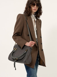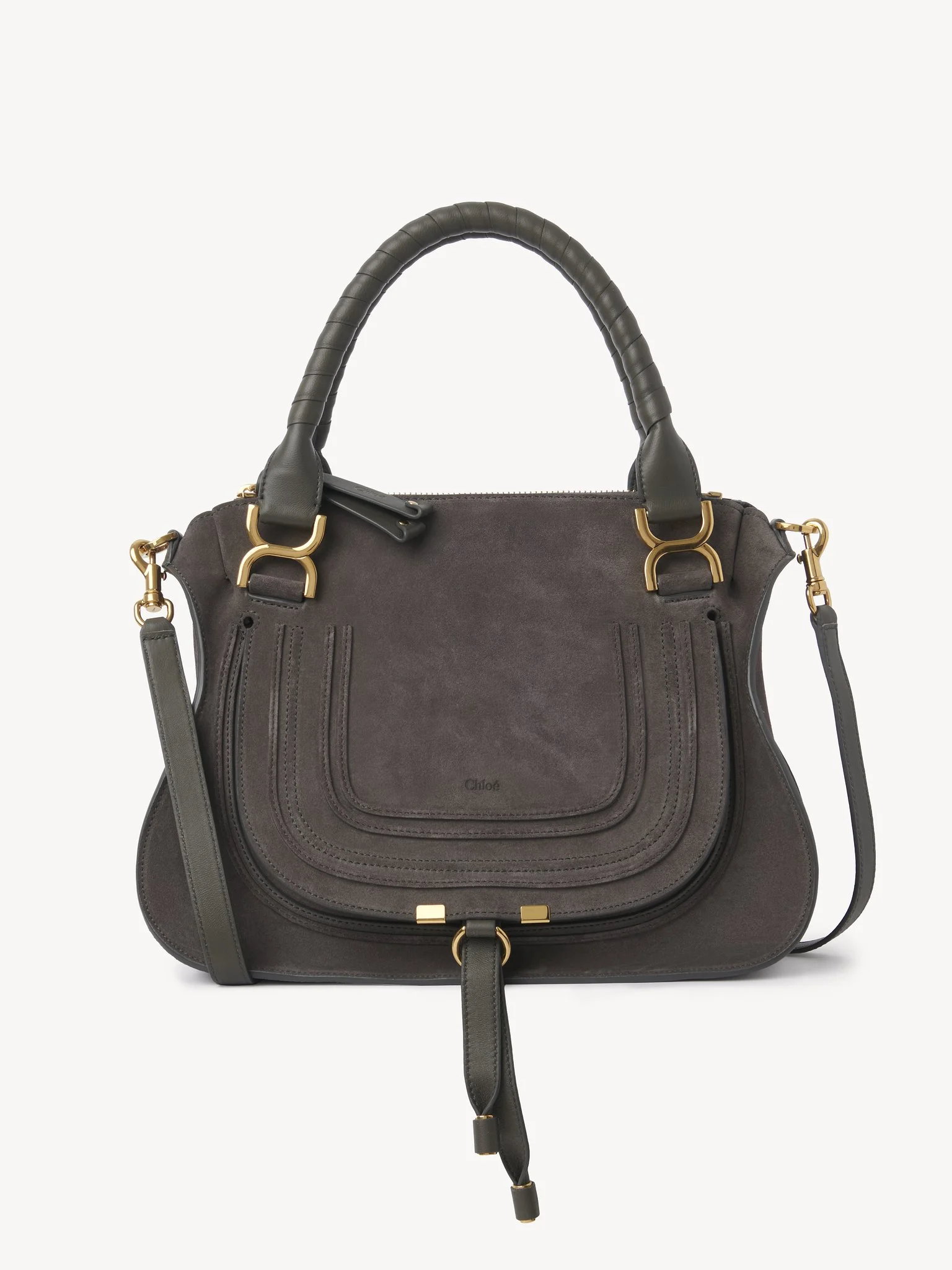 Crafted from suede calfskin, this Marcie double carry bag has a slouchy silhouette with feminine lines. It is finished with saddle stitching, iconic gold-tone buckles and hand-wrapped double handles. The line's dangling leather tassels secure the flap. Carry this leather bag in the hand, on the shoulder or crossbody with the handles or strap. PRODUCT DETAILS Marcie double carry bag in suede calfskin Main material: Split calfskin Secondary material: Calfskin Main lining: Lambskin Flap lining: Calfskin Carry: Hand, shoulder & crossbody - 1 main compartment - 1 Internal zipped pocket - 1 internal flat pocket - 1 removable leather strap - Zip closure Comes with a dust bag - Width: 13.8" (35 cm) - Height: 8.7" (22 cm) - Depth: 4.5" (11.5 cm) - Handle drop: 6.3" (16 cm) - Strap drop: 18.1" (46 cm) To make this product, Chloe worked with Leather Working Group (LWG) certified leather manufacturers. LWG certifies tanneries based on their water and energy usage, management of chemicals, solid waste, and wastewater. Color: Flannel Grey Item code: CH25AS660Q07036