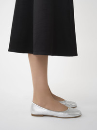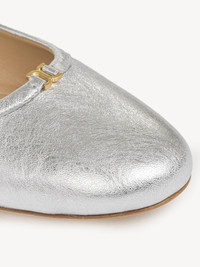 Crafted from supple metallic leather for a festive spirit and a comfortable fit, this Marcie ballerina has a timeless slip-on silhouette with an almond toe shape that lends a feminine allure. The iconic gold-toned Marcie signature details the upper for a subtle jewelry finish. Sophisticated yet versatile, this ballet flat will elevate a host of day-to-evening looks. PRODUCT DETAILS Flat ballerina - Inner sole: sheepskin - Main lining: sheepskin - Sole: 95% calf nubuck, 5% thermoplastic polyurethane - Upper: sheepskin Fit true to size, European sizing - Ballet flat - Slip-on To make this product, Chloé worked with Leather Working Group (LWG) certified leather manufacturers. LWG certifies tanneries based on their water and energy usage, management of chemicals, solid waste, and wastewater. Color: Silver Item code: CHC24S973DV9DL