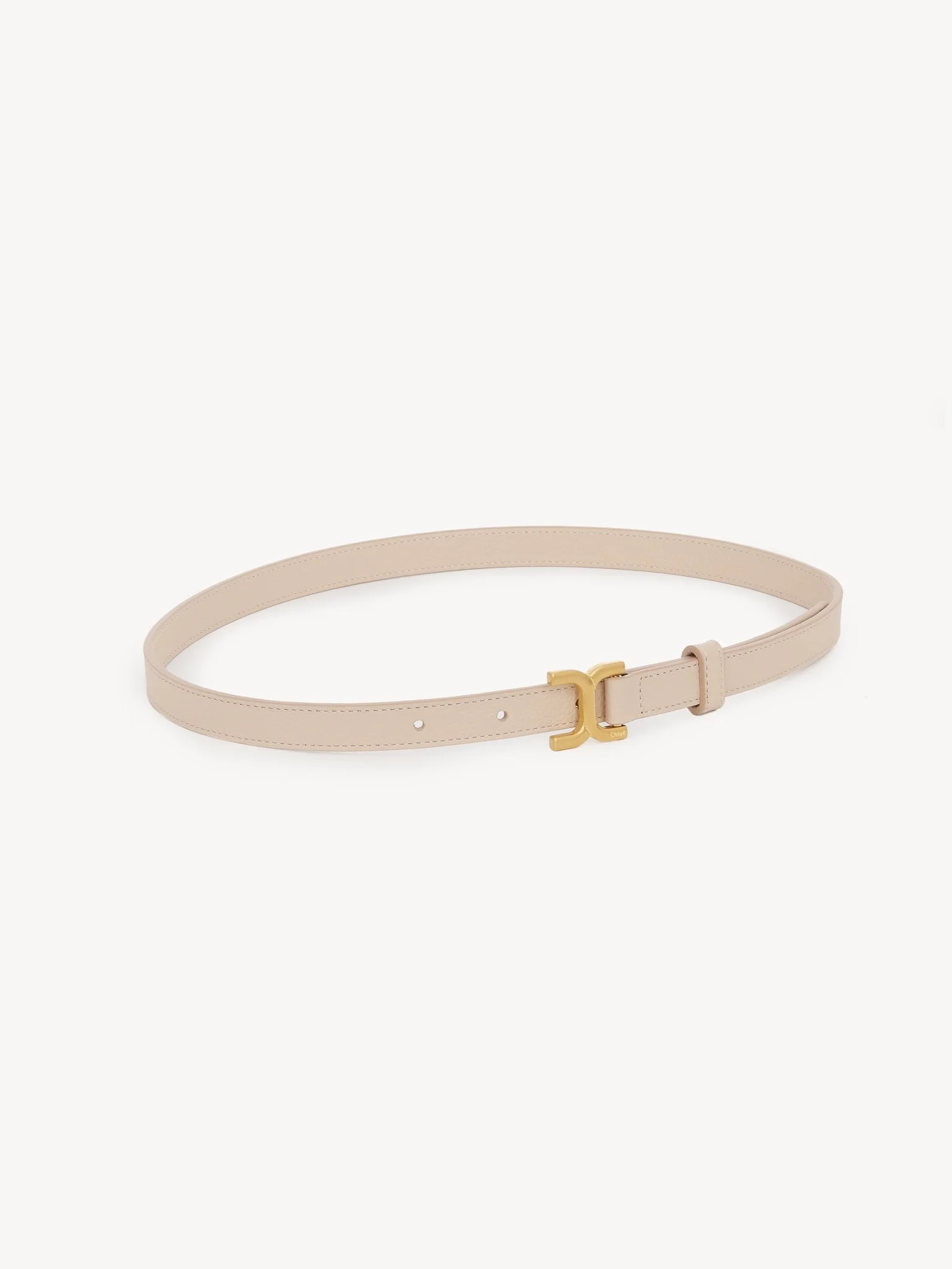 Crafted from grained calfskin in a thin, feminine style, this Marcie belt features the line's iconic signature in the metallic buckle. The design is inspired by vintage Chloé Marcie belts to build on the Maison's heritage. Fastened by a collar stud, the thin belt has clean lines for an everyday piece that elevates all jeans and pants. Multiple holes allow you to adjust the fit. PRODUCT DETAILS Belt in grained calfskin with the signature Marcie buckle Internal & external lining: Grained calfskin Buckle: Brass - S: 29.5" (75 cm) - M: 31.5" (80 cm) - L: 33.5" (85 cm) - Width: 0.6" (1.5 cm) - Chloé logo embossed on the leather & engraved on the buckle - Everyday thin belt worn on jeans or pants - 5 adjustment holes placed at 1” (3 cm) intervals - Collar stud fastening This belt is made from grained calfskin. The leather is chosen with care and crafted by artisans in our workshops in Italy. Our leathers have a richness that makes them unique (patina, color variations, marks, distinctive features, etc.). For optimal quality and durability, wear your belt regularly. Avoid exposure to direct sunlight and heat. Avoid contact with water, alcohol, perfume, chlorine and abrasive surfaces. Store your belt inside a pouch or in its box. Leather specialist cleaning only. To make this product, Chloé worked with Leather Working Group (LWG) certified leather manufacturers. LWG certifies tanneries based on their water and energy usage, management of chemicals, solid waste, and wastewater. Color: Cement Pink Item code: CHC24SC050MAR6J5