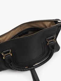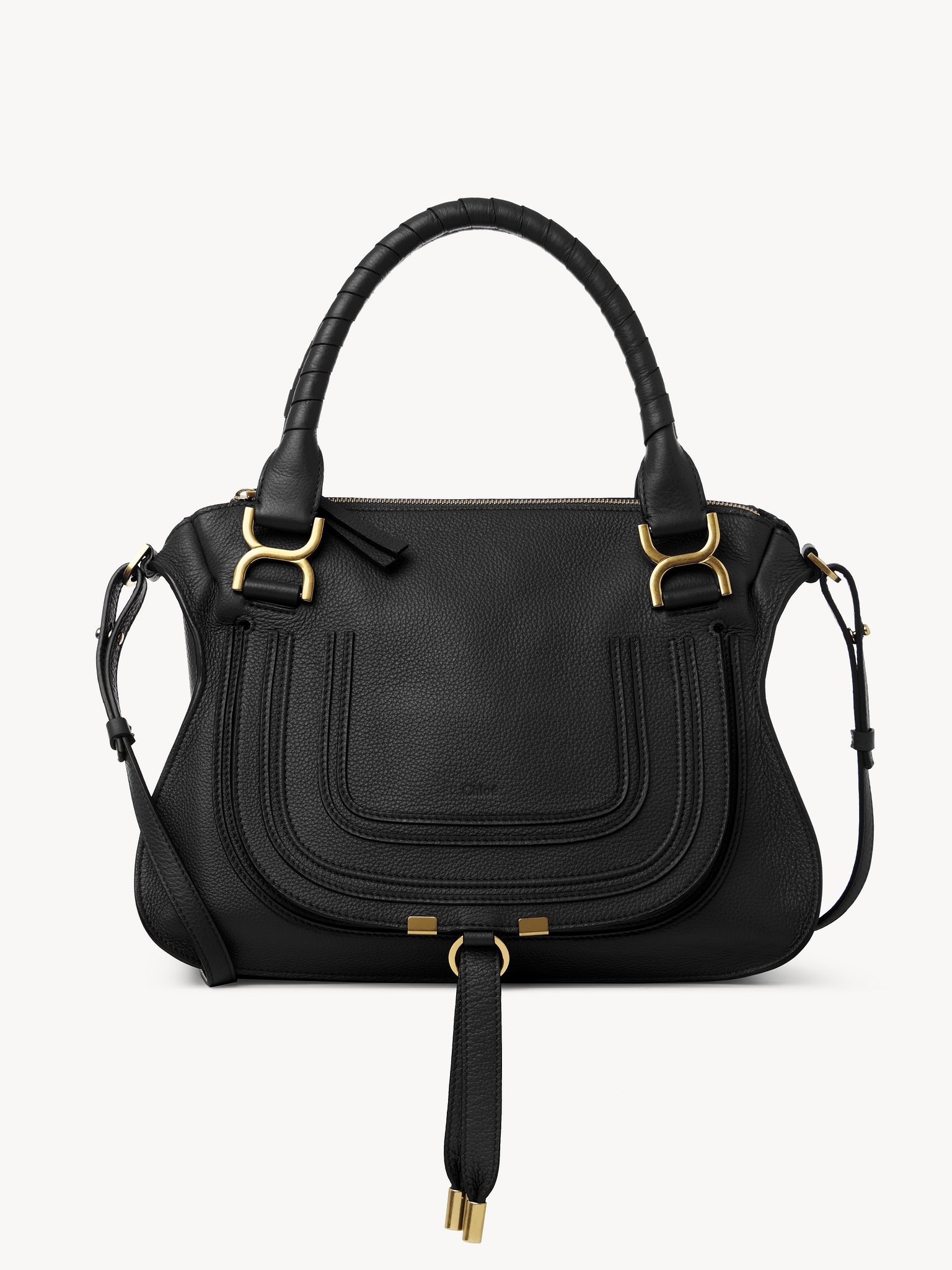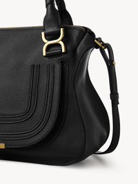 This iconic Marcie leather double carry bag is a roomy and practical day bag crafted from grained calfskin. Clean lines and a contoured design enhance the slouchy silhouette, while hand-wrapped leather handles add crafty detail. The detachable strap allows for casual, cross-body styling. All about Marcie... The Maison’s Marcie bag line blends a feminine aesthetic with a 70s folk spirit. Decorative saddle stitches create equestrian appeal, while the glint of brass hardware and the dangling tassel add a feminine touch. PRODUCT DETAILS Leather double carry bag in grained calfskin Carry: hand & long shoulder or cross-body - 1 Roomy compartment - 1 Front slip pocket hidden by the flap - 1 Internal zippered pocket - Removable leather strap - Antique gold finishing - Cotton lining Comes with a dust bag - Width: 14.2” (36 cm) - Height: 11.0" (28 cm) - Depth: 4.7" (12 cm) - Min. strap drop: 18.1" (46 cm) - Max. strap drop: 21.6” (55 cm) This double carry bag is made from semi-aniline leather. Tanning imparts a specific character to the skin, such as hues and wrinkles, combined with a light and transparent aniline finish. Respect care instructions on the leaflet. To make this product, Chloe worked with Leather Working Group (LWG) certified leather manufacturers. LWG certifies tanneries based on their water and energy usage, management of chemicals, solid waste, and wastewater. Color: black Item code: CHC21AS660F01001