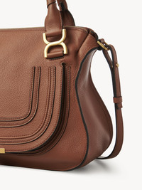 This iconic Marcie double carry bag is a roomy and practical day bag crafted from grained calfskin. Clean lines and a contoured design enhance the slouchy silhouette, while hand-wrapped leather handles add crafty detail. The detachable strap allows for casual, cross-body styling. All about Marcie... The Maison’s Marcie bag line blends a feminine aesthetic with a 70s folk spirit. Decorative saddle stitches create equestrian appeal, while the glint of brass hardware and the dangling tassel add a feminine touch. PRODUCT DETAILS Double carry bag in grained calfskin Carry: hand & long shoulder or cross-body - 1 Roomy compartment - 1 Front slip pocket hidden by the flap - 1 Internal zippered pocket - Removable leather strap - Antique gold finishing - Linen lining Comes with a dust bag - Width: 14.2” (36 cm) - Height: 11.0" (28 cm) - Depth: 4.7" (12 cm) - Min. strap drop: 18.1" (46 cm) - Max. strap drop: 21.6” (55 cm) This double carry bag is made from semi-aniline leather. Tanning imparts a specific character to the skin, such as hues and wrinkles, combined with a light and transparent aniline finish. Respect care instructions on the leaflet. To make this product, Chloe worked with Leather Working Group (LWG) certified leather manufacturers. LWG certifies tanneries based on their water and energy usage, management of chemicals, solid waste, and wastewater. Color: Tan Item code: CHC22AS660I3125M