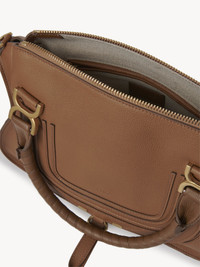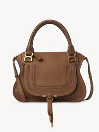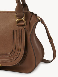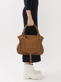 This iconic Marcie double carry bag is a roomy and practical day bag crafted from grained calfskin. Clean lines and a contoured design enhance the slouchy silhouette, while hand-wrapped leather handles add crafty detail. The detachable strap allows for casual, cross-body styling. All about Marcie... The Maison’s Marcie bag line blends a feminine aesthetic with a 70s folk spirit. Decorative saddle stitches create equestrian appeal, while the glint of brass hardware and the dangling tassel add a feminine touch. PRODUCT DETAILS Double carry bag in grained calfskin Main material: Calfskin Main lining: Linen Flap lining: Calfskin Carry: hand & long shoulder or cross-body - 1 Roomy compartment - 1 Front slip pocket hidden by the flap - 1 Internal zippered pocket - Removable leather strap - Antique gold finishing Comes with a dust bag - Width: 14.2" (36 cm) - Height: 11.0" (28 cm) - Depth: 4.7" (12 cm) - Min. strap drop: 18.1" (46 cm) - Max. strap drop: 21.6” (55 cm) This double carry bag is made from semi-aniline leather. Tanning imparts a specific character to the skin, such as hues and wrinkles, combined with a light and transparent aniline finish. Respect care instructions on the leaflet. To make this product, Chloé worked with Leather Working Group (LWG) certified leather manufacturers. LWG certifies tanneries based on their water and energy usage, management of chemicals, solid waste, and wastewater. Color: Pottery Brown Item code: CHC22AS660I31207