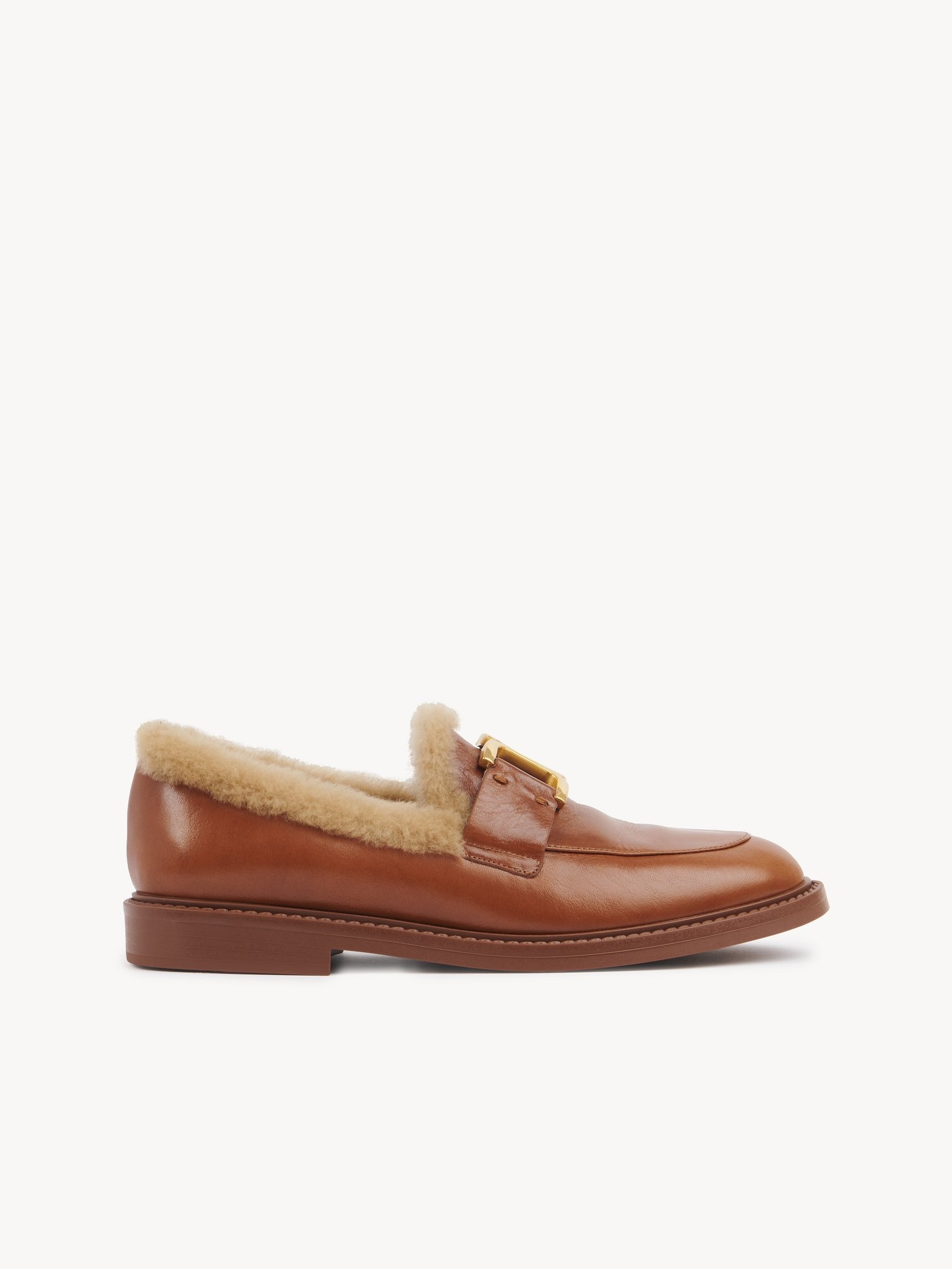 Reinterpreting the classic Marcie style, these shiny calfskin loafers feature a shearling lining for warmth and comfort. Highlighting the Maison's leather know-how, the minimalist upper combines with an almond toe shape and a slight heel for everyday wear. Marcie's Chloe-engraved gold-tone hardware lends a signature finish to these flat loafers. Pair with your daily looks for a Parisian attitude. PRODUCT DETAILS Loafer heel height: 0.8" (2 cm) Heel-to-toe drop: 0.6" (1.5 cm) Upper: calfskin Inner sole: lambskin shearling Main lining: calf fur Heel: thermoplastic polyurethane Fit true to size, European sizing - Slip-on To make this product, Chloe worked with Leather Working Group (LWG) certified leather manufacturers. LWG certifies tanneries based on their water and energy usage, management of chemicals, solid waste, and wastewater. Color: Cognac Brown Item code: CHC24W06NPA246