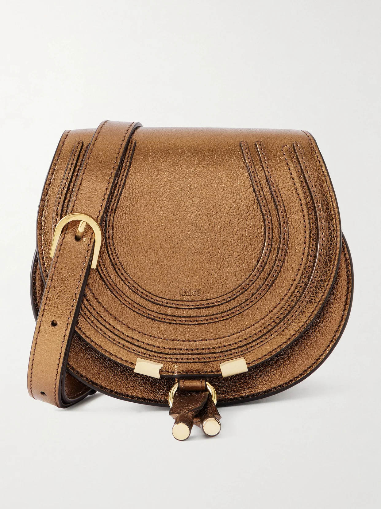 This version of Chloe's iconic 'Marcie' shoulder bag has a metallic finish, perfect for casual evening events. Crafted from leather, it has a round shape and a front flap accented with signature horseshoe-inspired stitching. Stow your phone, keys and cardholder inside.