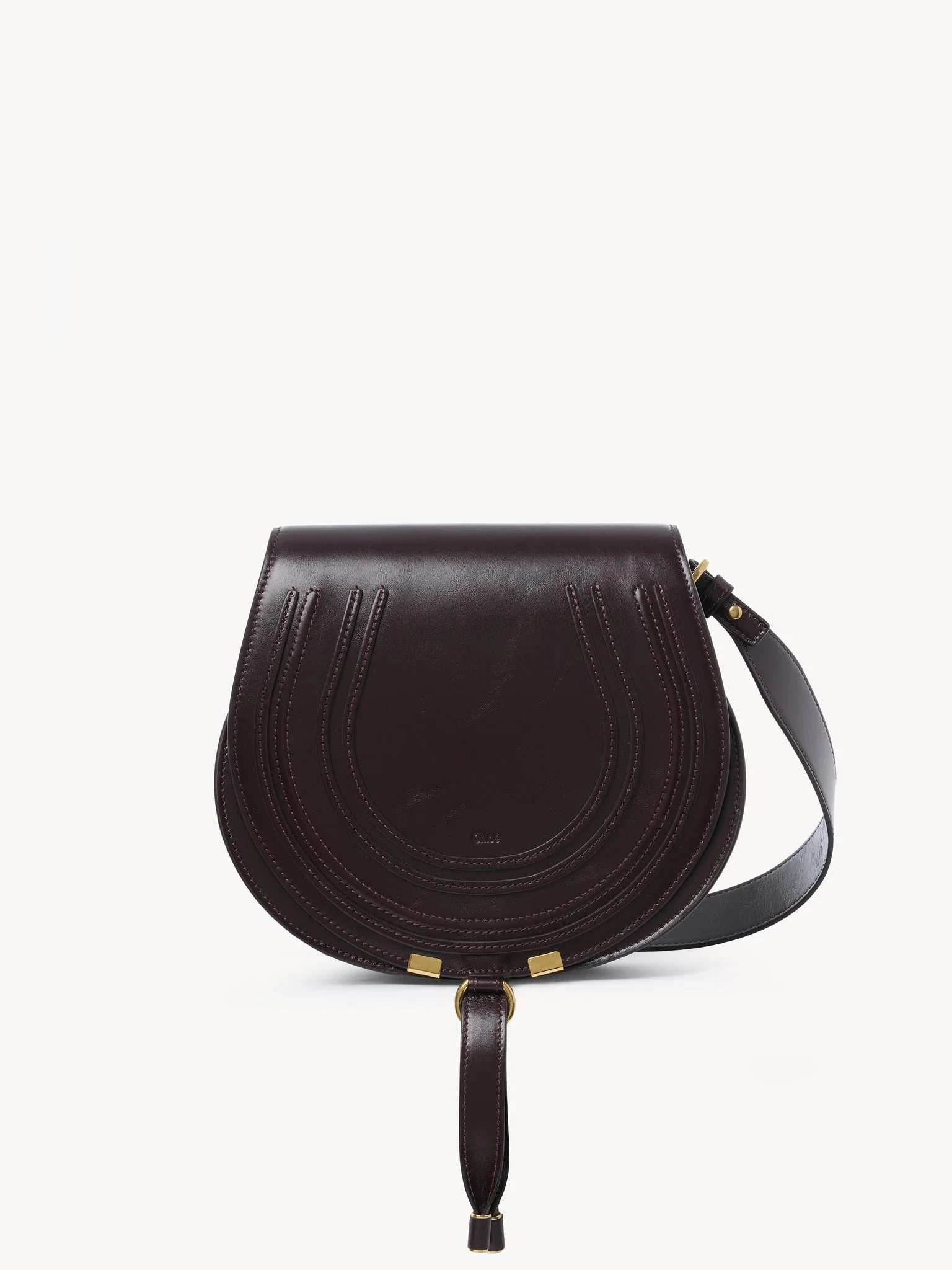 This Marcie saddle bag is crafted from shiny calfskin with a rounded silhouette and a clean top line. The flap features the line's iconic saddle stitching, secured with signature dangling leather tassels. This leather bag comes with a strap for shoulder or crossbody carry. PRODUCT DETAILS Marcie Saddle bag in shiny calfskin Main material: Calfskin Main lining: Calfskin Flap lining: Calfskin Carry: Shoulder & crossbody - 1 main compartment - 1 inside flat card pocket - 1 front slip pocket - 1 adjustable & removable strap - Tassel closure Comes with a dust bag - Width: 9.3" (23.5 cm) - Height: 8.7" (22 cm) - Depth: 3.1" (8 cm) - Min. strap drop: 17.7" (45 cm) - Max. strap drop: 21.7” (55 cm) To make this product, Chloe worked with Leather Working Group (LWG) certified leather manufacturers. LWG certifies tanneries based on their water and energy usage, management of chemicals, solid waste, and wastewater. Color: Auburn Red Item code: CH25WS679N57607