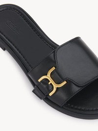 Matching a smooth calfskin upper with a TPU sole, this Marcie slide is an easy-to-wear style elevated by the stitched leather insole and the gold-toned Marcie buckle signature rooted in the Chloé DNA. Elegant and effortless, the slip-on mule features a comfortable, wide upper. The sole is suited to beach and city outings alike, while the striking hardware lends a refined finish to the relaxed silhouette. PRODUCT DETAILS Flat slide - Upper: calfskin - Inner sole: calfskin - Main lining: calfskin - Sole: thermoplastic polyurethane Fit true to size, European sizing - Slip-on mule To make this product, Chloé worked with Leather Working Group (LWG) certified leather manufacturers. LWG certifies tanneries based on their water and energy usage, management of chemicals, solid waste, and wastewater. Color: Black Item code: CHC24S00UH3001