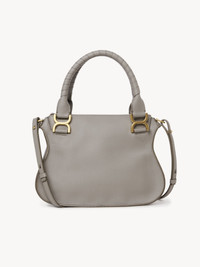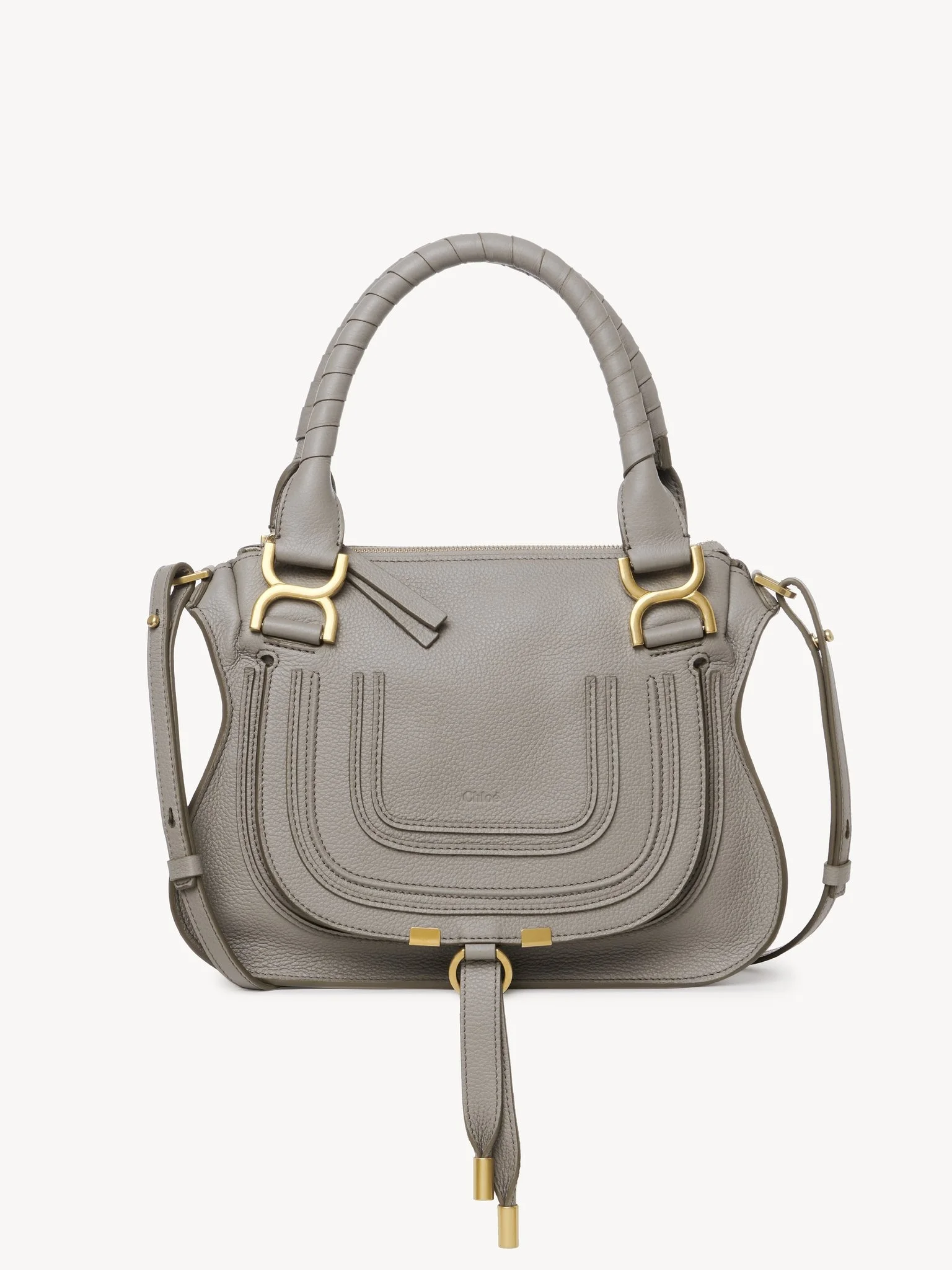 A more compact version of the iconic Marcie handbag, this small purse is crafted from grained calfskin. Clean lines and a contoured design enhance the slouchy silhouette, while hand-wrapped leather handles add crafty detail. The X-shaped buckles lend a refined finish. Double handles and a long, removable shoulder strap make this small double carry bag a truly versatile accessory. All about Marcie... The Maison’s Marcie bag line blends a feminine aesthetic with a 70s folk spirit. Decorative saddle stitches create equestrian appeal, while the glint of brass hardware and the dangling tassel add a feminine touch. PRODUCT DETAILS Small double carry bag in grained calfskin Carry: long shoulder, cross-body & hand - Roomy compartment - Zippered closure - Front slip pocket hidden by the flap - 1 internal zippered pocket - Removable leather strap attached with hooks - Linen lining Comes with a dust bag - Width: 11.8” (30 cm) - Height: 9" (23 cm) - Depth: 3.5" (9 cm) - Wide strap length: 20.1" (51 cm) This small double carry bag is made from semi-aniline leather. The half-transparent finish imparts a robust nature to the product while preserving its natural character. Respect care instructions on the leaflet. To make this product, Chloe worked with Leather Working Group (LWG) certified leather manufacturers. LWG certifies tanneries based on their water and energy usage, management of chemicals, solid waste, and wastewater. Color: Cashmere Gray Item code: CHC22AS628I31053