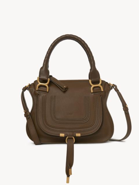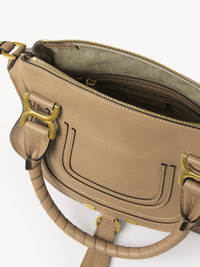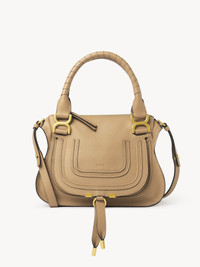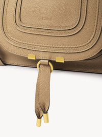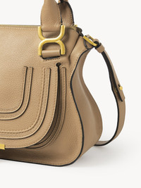 A more compact version of the iconic Marcie handbag, this small purse is crafted from grained calfskin. Clean lines and a contoured design enhance the slouchy silhouette, while hand-wrapped leather handles add crafty detail. The X-shaped buckles lend a refined finish. Double handles and a long, removable shoulder strap make this small double carry bag a truly versatile accessory. All about Marcie... The Maison’s Marcie bag line blends a feminine esthetic with a 70s folk spirit. Decorative saddle stitches create equestrian appeal, while the glint of brass hardware and the dangling tassel add a feminine touch. PRODUCT DETAILS Small double carry bag in grained calfskin Carry: long shoulder, cross-body & hand - Roomy compartment - Zipper closure - Front slip pocket hidden by the flap - 1 internal zippered pocket - 1 internal phone pocket - Removable leather strap attached with hooks - Cotton lining Comes with a dust bag - Width: 11.8" (30 cm) - Height: 9" (23 cm) - Depth: 3.5" (9 cm) - Wide strap length: 20.1" (51 cm) This small double carry bag is made from semi-aniline leather. The half-transparent finish imparts a robust nature to the product while preserving its natural character. Respect care instructions on the leaflet. To make this product, Chloe worked with Leather Working Group (LWG) certified leather manufacturers. LWG certifies tanneries based on their water and energy usage, management of chemicals, solid waste, and wastewater. Color: Milky Brown Item code: CHC22AS628I31281