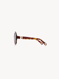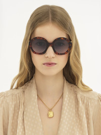 These Marcie round sunglasses pair a Havana frame in lower-impact acetate with gradient violet lenses. The line's signature gold metal piece details the temples. Drop-shaped openings at the temple tips make these sunglasses compatible with Chloe's eyewear jewelry. PRODUCT DETAILS Round sunglasses in lower-impact acetate & bio-based nylon - 100% UVA and UVB protection - Not prescription friendly - Chloe-engraved gold metal piece - Filter category: 2 These sunglasses come with a case and lens cloth - Lens: 2.1" (53 mm) - Bridge: 0.9" (23 mm) - Temple: 5.5" (140 mm) - Burnt Havana lower-impact acetate frame - Gradient violet lenses Item code: CHC25SEK0302226