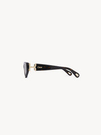 Marcie cat-eye sunglasses featuring a chunky beveled frame elevated with Marcie's signature gold metal piece at the hinges. Made from lower-impact acetate, the glossy Dark Havana frame is combined with solid light brown lenses in bio-based nylon. The Chloe logo details the left temple while drop-shaped openings at the temple tips make these women's sunglasses compatible with Chloe's eyewear jewelry. PRODUCT DETAILS Cat-eye sunglasses in lower-impact acetate & bio-based nylon - 100% UVA and UVB protection - Not prescription friendly - Filter category: 3 - Chloe logo engraved on the left temple These sunglasses come with a case and lens cloth - Lens: 2" (52 mm) - Bridge: 0.7" (19 mm) - Temple: 5.3" (135 mm) - Shiny Dark Havana frame - Gradient Brown lenses Item code: CHC24WEK0259218
