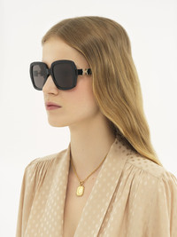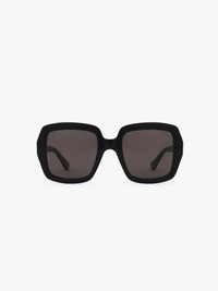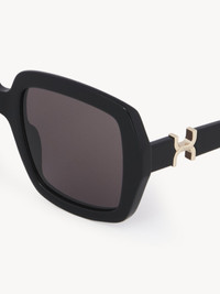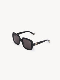 These Marcie square sunglasses pair a shiny black frame in lower-impact acetate with solid gray lenses. The line's signature gold metal piece details the temples. Drop-shaped openings at the temple tips make these sunglasses compatible with Chloe's eyewear jewelry. PRODUCT DETAILS Square sunglasses in lower-impact acetate & bio-based nylon - 100% UVA and UVB protection - Not prescription friendly - Chloe-engraved metal piece - Filter category: 3 These sunglasses come with a case and lens cloth - Lens: 2" (52 mm) - Bridge: 0.9" (22 mm) - Temple: 5.5" (140 mm) - Black lower-impact acetate frame - Solid gray lenses Item code: CHC25SEK0301001