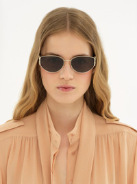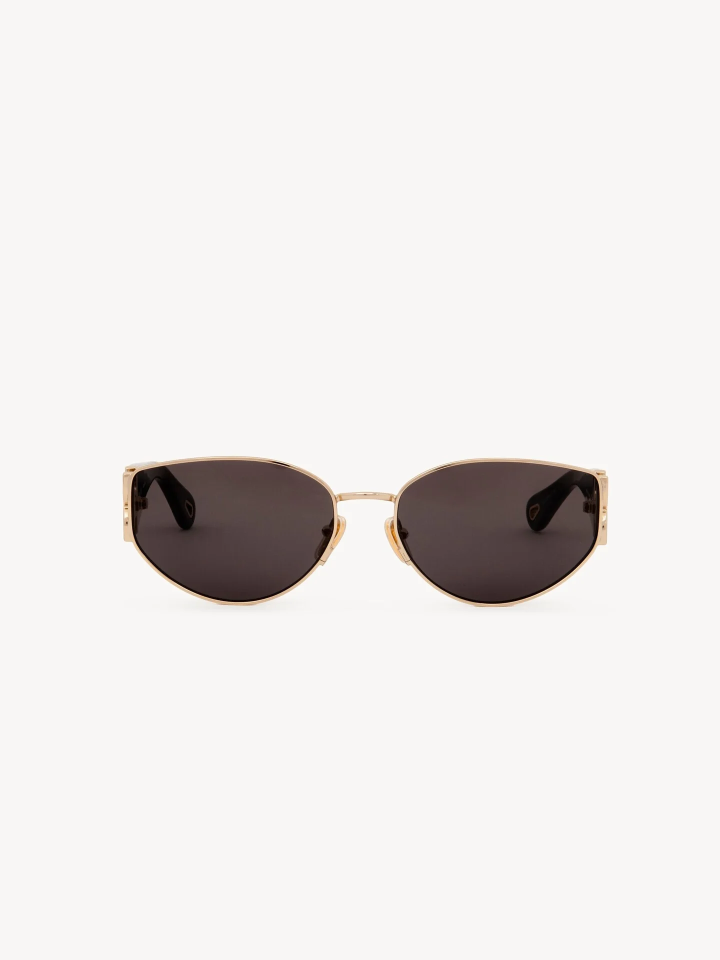 Marcie cat-eye sunglasses featuring gold metal rims elevated with Marcie's signature gold metal piece at the hinges. The glossy black temples are made from lower-impact acetate, combined with solid gray lenses in bio-based nylon. The Chloe logo details the left temple while drop-shaped openings at the temple tips make these women's sunglasses compatible with Chloe's eyewear jewelry. PRODUCT DETAILS Cat-eye sunglasses in lower-impact acetate & bio-based nylon - 100% UVA and UVB protection - Not prescription friendly - Filter category: 3 - Chloe logo engraved on the left temple These sunglasses come with a case and lens cloth - Lens: 2.3" (59 mm) - Bridge: 0.7" (17 mm) - Temple: 5.3" (135 mm) - Shiny classic gold & shiny black frame - Gray lenses Item code: CHC24WEK0260752