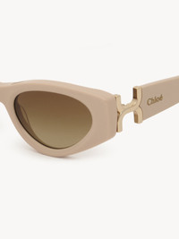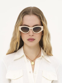 These Marcie cat-eye sunglasses pair an ivory frame in lower-impact acetate with gradient brown lenses. The line's signature gold metal piece details the temples. Drop-shaped openings at the temple tips make these sunglasses compatible with Chloe's eyewear jewelry. PRODUCT DETAILS Cat-eye sunglasses in lower-impact acetate & bio-based nylon - 100% UVA and UVB protection - Not prescription friendly - Chloe logo engraved on the left temple - Filter category: 2 These sunglasses come with a case and lens cloth - Lens: 2" (52 mm) - Bridge: 0.7" (19 mm) - Temple: 5.3" (135 mm) These sunglasses are made with carefully selected materials. Please handle with care for a longer product life. - Store in the case provided. - Clean with a soft, dry cloth. - If necessary, use a damp cloth and mild detergent. Do not use solvents or aggressive detergents which may alter the features of the sunglasses. - Ivory lower-impact acetate frame - Gradient brown lenses Item code: CHC24WEK0259103