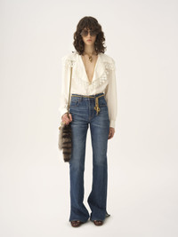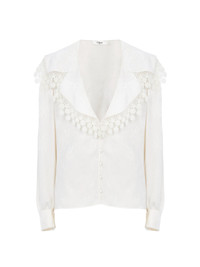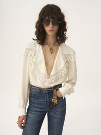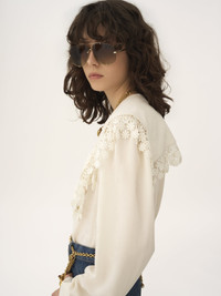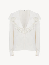 Maxi-collar blouse in matte and shiny organic silk with a floral jacquard pattern, featuring a floral lace trim and fabric-covered buttons. PRODUCT DETAILS Maxi-collar blouse outer shell: 100% Silk Collar lace: 80% Cotton, 20% Polyester Fit: straight - The model is 5'10" (178 cm) and wears a prototype in size 36 - Silk blouse - Fabric-covered buttons through front & at cuffs Organic silk manufacturing restricts the use of pesticides, insecticides or harsh chemicals and incorporates methods that respect biodiversity, improve soil quality and reduce water consumption. Color: Iconic Milk Item code: CH25WHT15323107