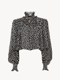 DESCRIPTION Maxi gathered high-neck top in silk jacquard with a dots print, featuring rounded shoulders and gold-tone buttons. PRODUCT DETAILS Gathered high-neck top outer shell: 100% Silk Fit: oversized - The model is 5'10" (178 cm) and wears a prototype in size 36 - High-neck silk top - Gold-tone buttons at collar & cuffs This product was made in collaboration with Akanjo, a certified WFTO supplier. Akanjo is a social enterprise located in Madagascar that places equal pay and employees' health & wellbeing at the core of their priorities. A long-standing partner of Chloe for 15 years, Akanjo is also committed to training and promoting craftsmanship. Color: Black Item code: CH26SHT90300915 CARE INSTRUCTIONS To preserve the integrity of your garment, please refrain from washing, entrusting its care to professional cleaning services for optimal maintenance. This garment cannot withstand any bleaching agent. To maintain its shape, gently iron this garment at a maximum sole plate temperature of 110°C, taking care to avoid any harsh pressure while ironing. Entrust this garment to a specialist for mild cleaning with tetrachloroethylene and solvent F, ensuring its delicate nature is maintained with the most care. To best preserve its form and texture, please do not tumble dry this garment. To maintain its delicate nature, do not wet clean this garment. TRACEABILITY Better traceability is central to improving our materials as well as social and environmental practices. Finishing: Italy Weaving: China