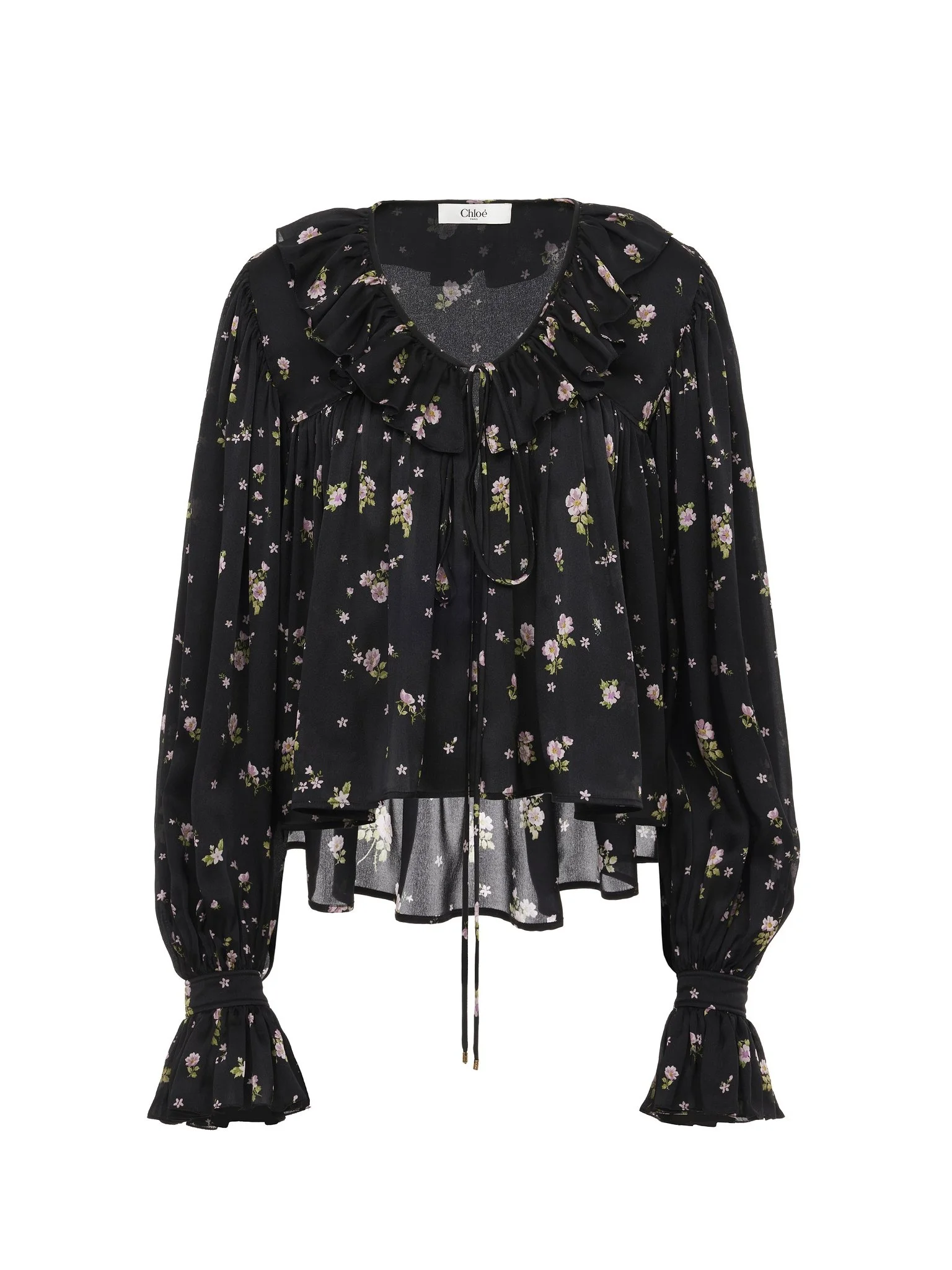 V-neck maxi gathered ruffle top in silk charmeuse with a Liberty print and a silk-mix lining, featuring a flouncy neckline, gathered details and dangling ties with gold-tone metal tips. PRODUCT DETAILS Ruffle top outer shell: 100% Silk Lining: 68% Acetate fiber, 32% Silk Buttons: 100% Mother-of-pearl Fit: maxi - The model is 5'10" (178 cm) and wears a prototype in size 36 - Printed silk top - Mother-of-pearl buttons at cuffs - Dangling ties with hammered metal tips Color: Black Item code: CH25AHT27481001