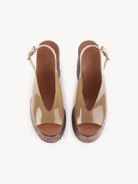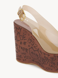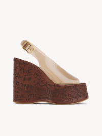 Set on a wood-effect platform, these Maxime wedge sandals feature a peep-toe upper in transparent TPU. The sole references the Maison's heritage like engraved love notes on trees. A Chloe-engraved buckle finishes these sandals for a comfortable fit. PRODUCT DETAILS Sandal heel height: 5.1" (13 cm) Heel-to-toe drop: 3.1” (8 cm) Upper: TPU Inner sole: cowhide Main lining: TPU Sole: TPU Heel: calfskin Fit true to size, European sizing - Buckle fastening Color: Sunny Brown Item code: CHC25U09ZRT260