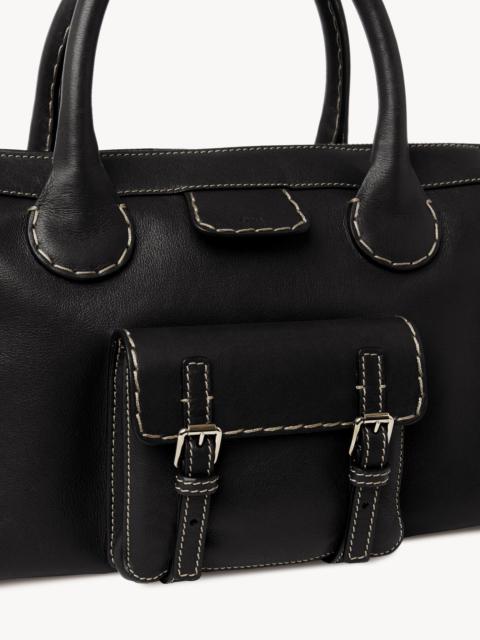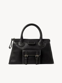 Showcasing the Maison's leather craftsmanship, this medium Edith day bag features a front pocket with functional buckles, a rounded handle base, and a characteristic Chloé-embossed leather tag. Ecru stitching adds equestrian-inspired detail. This version is crafted from buffalo leather with linen lining for a refined finish coupled with a lower environmental impact. Carry the handbag on your arm or sling it on your shoulder with the removable strap. All about Edith... A cornerstone of creative director Gabriela Hearst's vision for Chloé, Edith is characterized by its casual allure and 70s spirit. The reissue of this iconic line is true to the original style and pays tribute to Chloé's heritage and strong DNA. PRODUCT DETAILS Day bag in buffalo leather Carry: shoulder & arm - Top zipper opening - Inside zipped pocket - Inside flat leather pocket - Removable strap - Bottom studs - Linen lining Comes with a dust bag - Width: 16.5" (42 cm) - Height: 9.1" (23 cm) - Depth: 7.9" (20 cm) - Strap drop: 18.9" (48 cm) - Handle drop: 5.9" (15 cm) This handbag is made from semi-aniline leather. The half-transparent finish imparts a robust nature to the product while preserving its natural character. Follow care instructions on the leaflet. Color: black Item code: CHC21WS450F43001