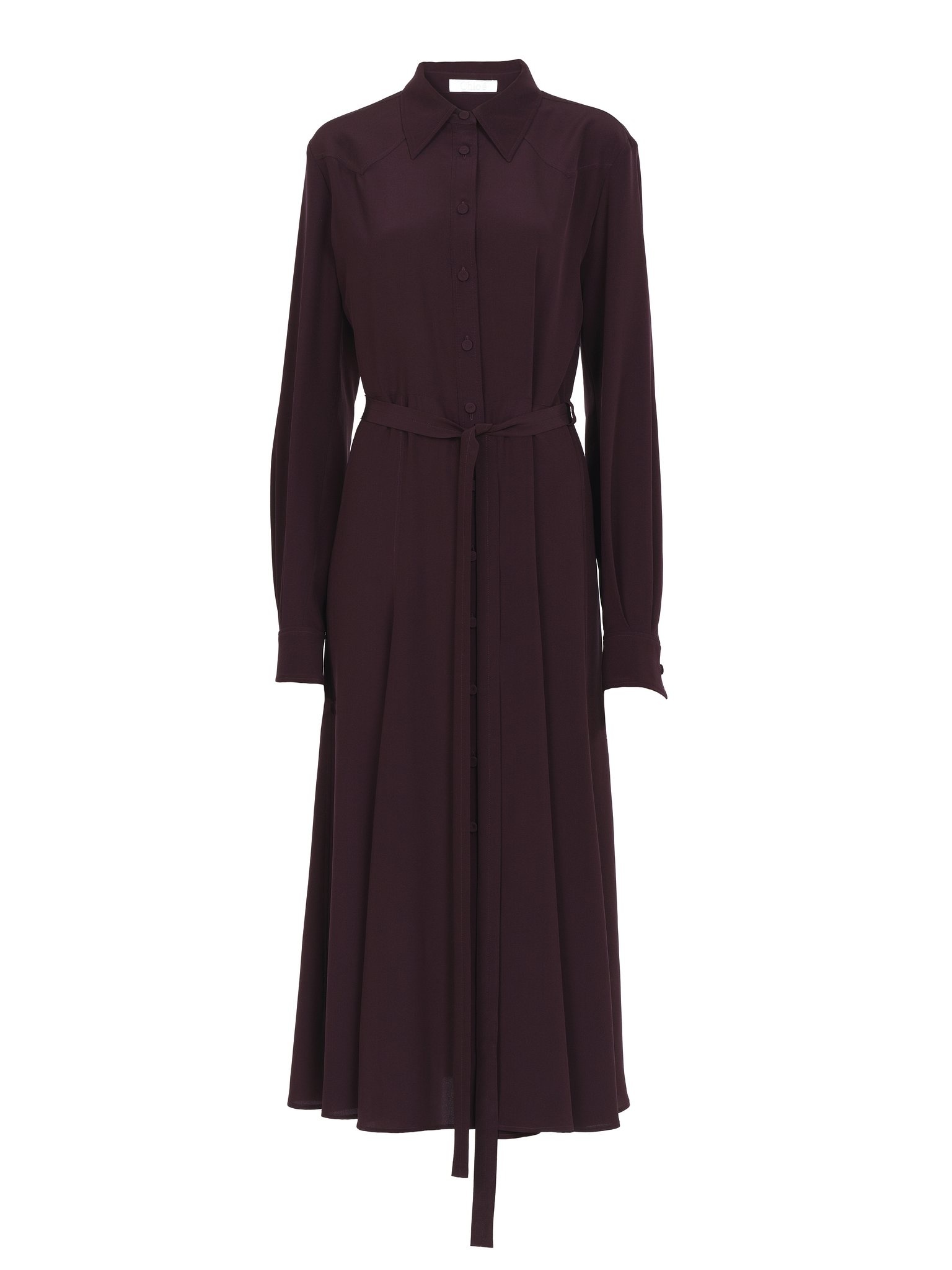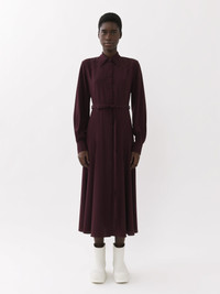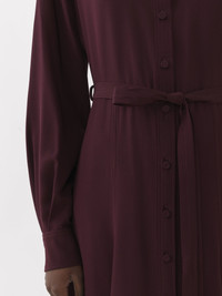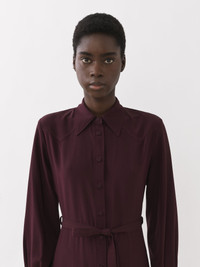 Chloé's iconic crêpe de chine is woven from organically produced silk in this midi shirt dress. The classic, button-down silhouette gets a city flou update with a unique twist in the western-inspired yoke. The self-fabric belt elegantly cinches the waist for a feminine finish. PRODUCT DETAILS Midi shirt dress main material: 100% Silk Care: dry clean only Fit: midi length, straight - The model is 5’10” (178 cm) and wears a prototype in size 36 - Long sleeved silk dress - Buttons through the front - Self-fabric belt This product is made from organic silk. Organic silk manufacturing restricts the use of pesticides, insecticides or harsh chemicals and incorporates methods that respect biodiversity, improve soil quality and reduce water consumption. Color: Obscure Purple Item code: CHC23ARO5800456A