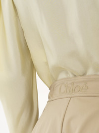 Mini balloon shorts in light organic cotton gabardine, featuring tonal Chloe logo embroidery at the back. The integrated buckled belt has dangling ties finished with gold-tone Chloe logo plates. PRODUCT DETAILS Balloon shorts outer shell: 100% Cotton Lining: 100% Cotton Buttons: 100% Horn Fit: generous, mini length - The model is 5'10" (178 cm) and wears a prototype in size 36 - Utilitarian cotton shorts - Front hook fastening - Side pockets - Integrated buckled belt Care: dry cleaning only An organic cotton farming system sustains the health of soils, ecosystems and people by eliminating the use of toxic and persistent organic pollutants and increasing water conservation. Color: Smoky Beige Item code: CH25USH2811823I