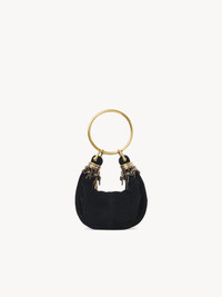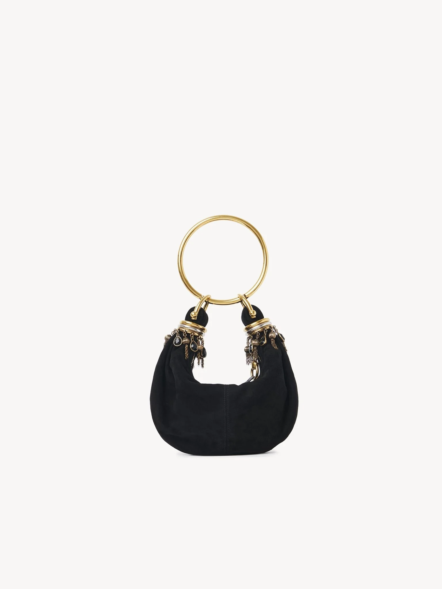 Inspired by the Maison's Archives, this mini Bracelet Hobo bag is crafted from suede goatskin with a supple, rounded shape elevated by a bracelet handle. Stacked bi-color rings and dangling beads add jewelry embellishment. Carry the mini Bracelet bag in the hand, on the shoulder or crossbody. PRODUCT DETAILS Mini Bracelet Hobo bag in suede goatskin with beads Main material: Goatskin Secondary material: Calfskin Main lining: Lambskin Carry: Hand, shoulder & crossbody - 1 main compartment - 1 inside flat pocket - 1 removable ring handle - 1 adjustable & removable strap - Zip closure Comes with a dust bag - Width: 8.3" (21 cm) - Height: 5.5" (14 cm) - Depth: 2.4" (6 cm) - Handle drop: 8.7" (22 cm) - Min. strap drop: 16.5" (42 cm) - Max. strap drop: 19.7" (50 cm) To make this product, Chloe worked with Leather Working Group (LWG) certified leather manufacturers. LWG certifies tanneries based on their water and energy usage, management of chemicals, solid waste, and wastewater. Color: Black Item code: CH25AS623Q06001