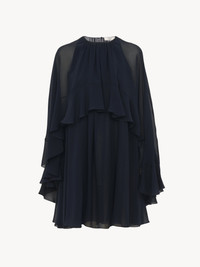 Fluid mini cape dress in organic silk georgette, combining a separate sleeveless dress lining with a removable cape and ruffles. PRODUCT DETAILS Short cape dress outer shell: 100% Silk Lining: 68% Acetate fiber, 32% Silk Removable cape: 100% Silk Button: 100% Mother-of-pearl Fit: fluid, mini length - The model is 5’10” (178 cm) and wears a prototype in size 36 - Short silk dress - Mother-of-pearl button - Sleeveless dress lining with American armholes Care: dry cleaning only Organic silk manufacturing restricts the use of pesticides, insecticides or harsh chemicals and incorporates methods that respect biodiversity, improve soil quality and reduce water consumption. This product was made in collaboration with Akanjo, a certified WFTO supplier. Akanjo is a social enterprise located in Madagascar that places equal pay and employees' health & wellbeing at the core of their priorities. A long-standing partner of Chloe for 15 years, Akanjo is also committed to training and promoting craftsmanship. Color: Graphite Blue Item code: CH24WRO5512348Q