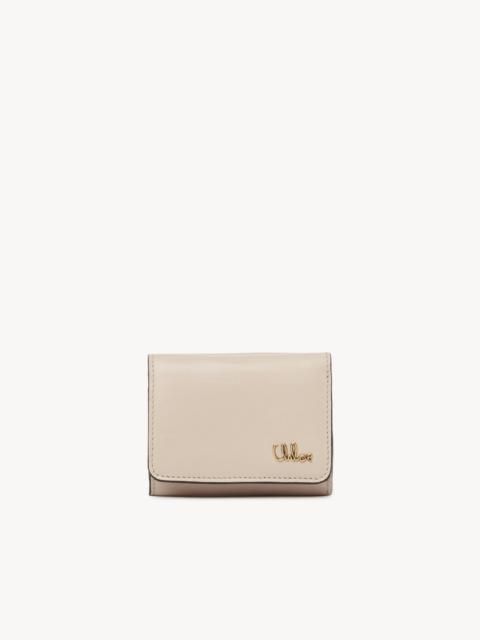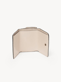 Crafted from shiny calfskin, the mini Chloe Iconic tri-fold wallet combines a minimalist design with a metallic signature from the Maison's archives. Sized to slip easily into a clutch or small bag, this compact wallet features a bill compartment and multiple pockets. PRODUCT DETAILS Mini tri-fold wallet in shiny calfskin Main lining: Calfskin Inner lining: 65% Polyester, 35% Cotton - 1 back pocket with flap - 1 bill compartment - 3 flat pockets - Snap button closure Comes with a dust bag - Width: 3.9" (10 cm) - Height: 2.8" (7 cm) - Depth: 1.2" (3 cm) This tri-fold wallet is made from natural leather with a very light finish. Keep away from water (rain). The wallet may develop smooth or light halos. If the leather gets wet, dry it with a soft white cloth to absorb water. With use, the leather may become marked. To make this product, Chloe worked with Leather Working Group (LWG) certified leather manufacturers. LWG certifies tanneries based on their water and energy usage, management of chemicals, solid waste, and wastewater. Color: Cement Pink Item code: CH25SP487O166J5