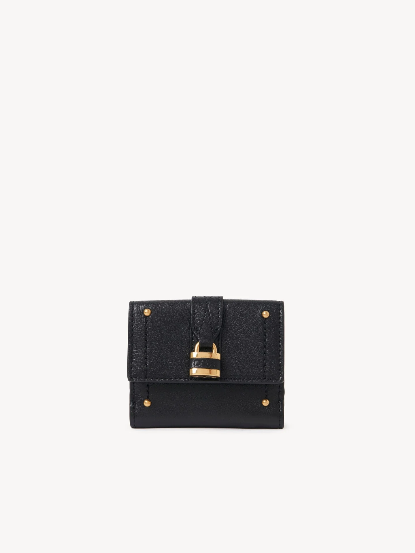 DESCRIPTION Crafted from grained buffalo leather, this mini Paddington tri-fold wallet is embellished with a gold-tone padlock and studs in a nod to the Maison's iconic bag. This mini wallet features a bill compartment and coin pocket. PRODUCT DETAILS Mini Paddington tri-fold wallet in grained buffalo leather Main lining: Calfskin Inside trim: 65% Polyester, 35% Cotton - 1 front coin pocket with flap - 1 bill compartment - 3 card slots - Snap button closure Comes with a dust bag - Width: 3.7" (9.5 cm) - Height: 3.1" (8 cm) - Depth: 1.2" (3 cm) To make this product, Chloe worked with Leather Working Group (LWG) certified leather manufacturers. LWG certifies tanneries based on their water and energy usage, management of chemicals, solid waste, and wastewater. Color: Black Item code: CH26SP914O37001 CARE INSTRUCTIONS In order to protect this article, we recommend that you: avoid rubbing against abrasive materials shield it from humidity, light and heat avoid contact with liquids and greasy substances (makeup, cream) store your product carefully in its dustcover when not in use avoid rubbing against color-contrasting clothes or materials. To remove a water stain, gently soak up liquid by dabbing it with a white cloth should a scratch occur on the leather, you can gently massage it with the same type of cloth for all other issues, please contact the Chloe after-sales service or a specialist. TRACEABILITY Better traceability is central to improving our materials as well as social and environmental practices. Dyeing: Italy Finishing: Italy Tanning: Italy