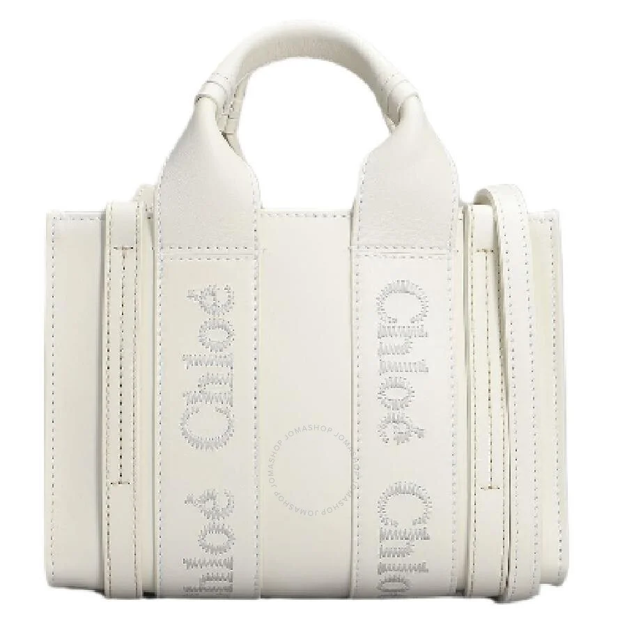 Brand: Chloe. SKU: CHC23SP237I60101. Color: White. Size: W: 7.9" x H: 5.5" x D: 1.6". Chloe Mini Woody Leather Tote Bag. This tote bag is made from luxurious smooth calfskin, accented with shiny calfskin strips and a linen lining. Its sleek, modern design is enhanced by vertical leather strips and the brand's signature logo ribbon. The bag features a main compartment that fits a mobile phone and offers versatile carrying options: by hand, on the shoulder, or cross-body. 100% Calfskin, 100% Linen. Made in Italy. GENERAL Size Info: W: 7.9" x H: 5.5" x D: 1.6" Color: White INFORMATION Brand: Chloe Gender: Womens Model: CHC23SP237I60101 DETAILS Material: Calfskin, Linen Closure: Open ADDITIONAL INFO UPC Code: 7613386665829 Jomashop Sku: Z-8399P Department: Bags Category: Tote Bags