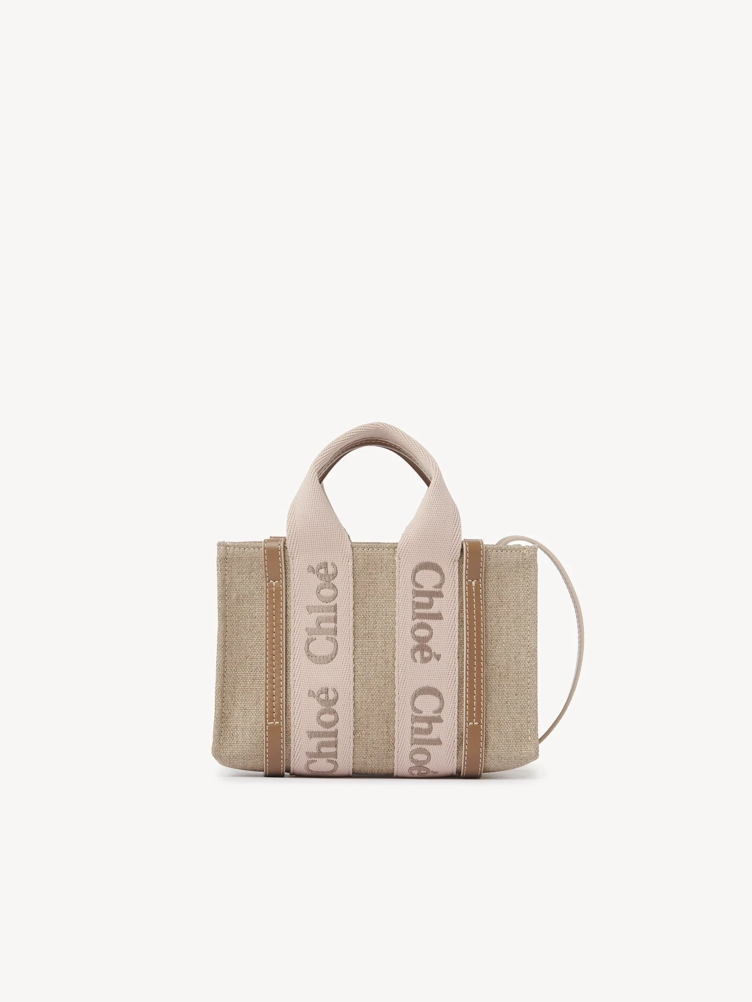 Crafted from linen canvas detailed with shiny calfskin strips, this mini Woody tote bag is a compact accessory with a strong summer attitude. The main compartment fits a cell phone. The bag's modern lines are emphasized by the contrasting vertical leather strips and the signature Chloé logo. Carry this mini bag in hand or cross-body with the long strap. All about Woody... The Woody line is characterized by the signature Chloé logo carried over from the Maison's iconic mules. It showcases a modern, minimalist silhouette ranging from nano to large sizes. PRODUCT DETAILS Mini tote bag in linen canvas & shiny calfskin with Chloé logo Main lining: Linen Carry: Hand, long shoulder & cross-body - 1 strap & 1 top handle - 1 main compartment (fits a cell phone) Comes with a dust bag - Width: 7.9" (20 cm) - Height: 5.5" (14 cm) - Depth: 1.6" (4 cm) - Handle drop: 3.1" (8 cm) - Strap drop: 21.7" (55 cm) This mini tote bag is made from linen. In an effort to limit its environmental impact and have a positive influence on society, Chloé is accelerating its transition to more responsible sourcing. This progress is most notably reflected in the introduction of linen – an inherently low-impact material – to the collection. Respect the care instructions on the leaflet. To make this product, Chloé worked with Leather Working Group (LWG) certified leather manufacturers. LWG certifies tanneries based on their water and energy usage, management of chemicals, solid waste, and wastewater. Color: Blushy Beige Item code: CHC24UP237L1726Y