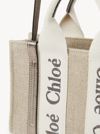 Crafted from linen canvas and metallized calfskin, this mini Woody tote bag is a compact accessory with an everyday attitude. The main compartment fits a mobile phone. The bag's modern lines are emphasized by the contrasting vertical leather strips and the signature Chloe logo. Carry in hand or crossbody with the long strap. PRODUCT DETAILS Mini tote bag in linen canvas & metallized calfskin with Chloe logo Main lining: 68% Linen, 32% Cotton Carry: Hand, long shoulder & crossbody - 1 strap & 1 top handle - 1 main compartment (fits a mobile phone) Comes with a dust bag - Width: 7.9" (20 cm) - Height: 5.5" (14 cm) - Depth: 1.6" (4 cm) - Handle drop: 3.1" (8 cm) - Strap drop: 20.5" (52 cm) Linen, hemp and ramie cultivations emit fewer greenhouse gases and require less water compared to other conventional natural fibers, which is why they are considered lower-impact materials by nature. To make this product, Chloe worked with Leather Working Group (LWG) certified leather manufacturers. LWG certifies tanneries based on their water and energy usage, management of chemicals, solid waste, and wastewater. Color: Shiny Grey Item code: CHC25SP237O81074