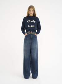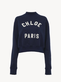 Mock-neck sweater in cotton fleece with a cropped, boxy shape featuring varsity Chloé logo appliqué patches. PRODUCT DETAILS Mock-neck sweater outer shell: 100% Cotton Ribbing: 100% Cotton Front application: 100% Polyester Care: gentle wash 85°F (30°C) Fit: cropped, boxy - The model is 5'10" (178 cm) and wears a prototype in size XS - Slips on Color: Classic Navy Item code: CH24AJH121924C6