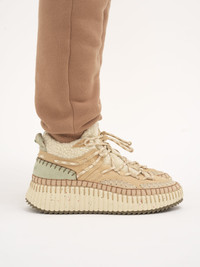 Reinterpreting the iconic Nama style, these warm and comfortable sneakers are crafted from suede calfskin, shearling and a mix of lower impact-materials. Set on a chunky, ridged sole, the lightweight design pairs a high-top silhouette with decorative criss-cross laces for a hiking aesthetic. These leather sneakers are finished with the line's signature hand-stitching and an embossed Chloe logo. PRODUCT DETAILS Sneaker heel height: 2" (5 cm) Heel-to-toe drop: 0.8" (2cm) Upper 1: suede cowhide Upper 2: 50% polyester, 50% wool Upper 3: polyester Inner lining: calfskin Inner sole: ethylene vinyl acetate Main lining: 88% polyester, 12% polyurethane Secondary lining: 50% polyester, 50% wool Sole: 60% ethylene vinyl acetate, 40% rubber Fit true to size, European sizing - Slip-on Store these sneakers away from direct sunlight, heat and rain. To prevent color migration, avoid any contact with other leathers. To maintain the velvety appearance of suede or nubuck leather, gently clean with a crepe brush, taking care not to scratch metal parts. To make this product, Chloe worked with Leather Working Group (LWG) certified leather manufacturers. LWG certifies tanneries based on their water and energy usage, management of chemicals, solid waste, and wastewater. Color: Milky Mint Item code: CHC24S991HB39P